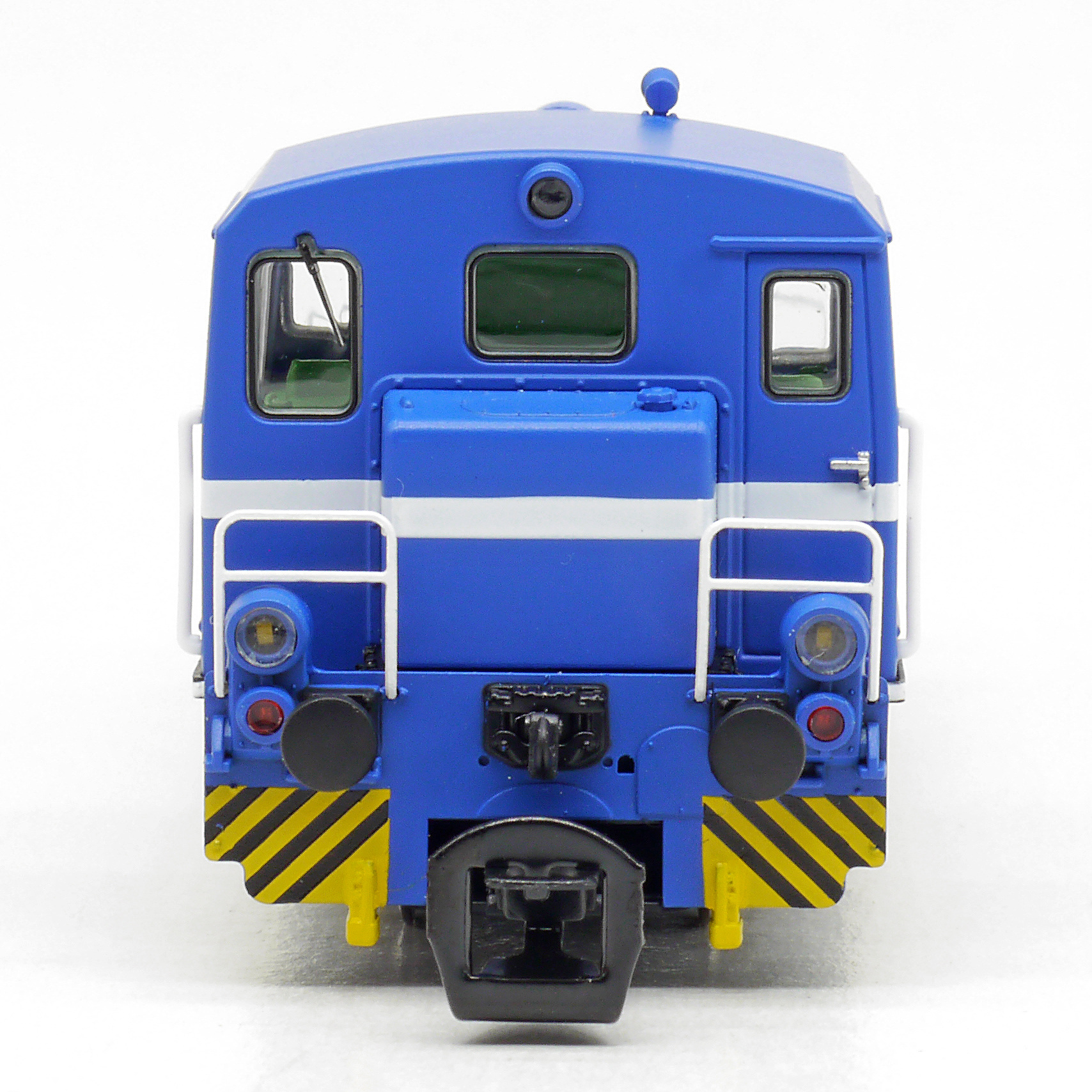 | dieselová lokomotiva modrá s černý pojezdem a bílým lemováním |
