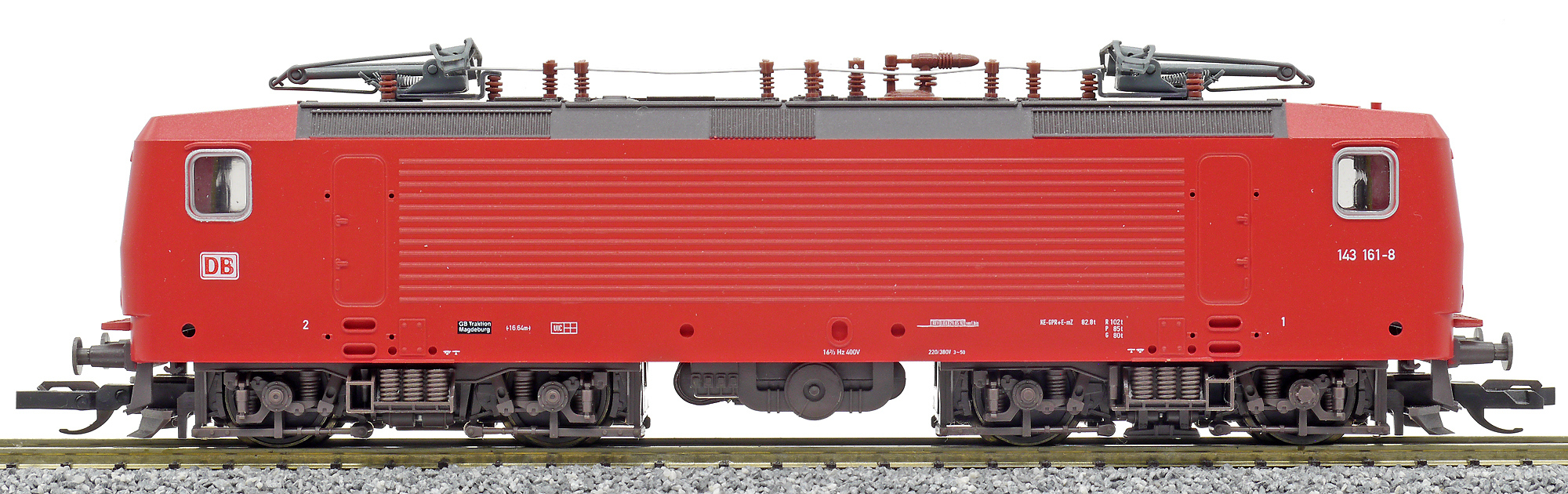 Kód   04341  [Lokomotivy] → [Elektrické] → [BR 143] → 04341: elektrická lokomotiva červená, šedá střecha a rám, černý pojezd „db-gebrauchtzug.de“
