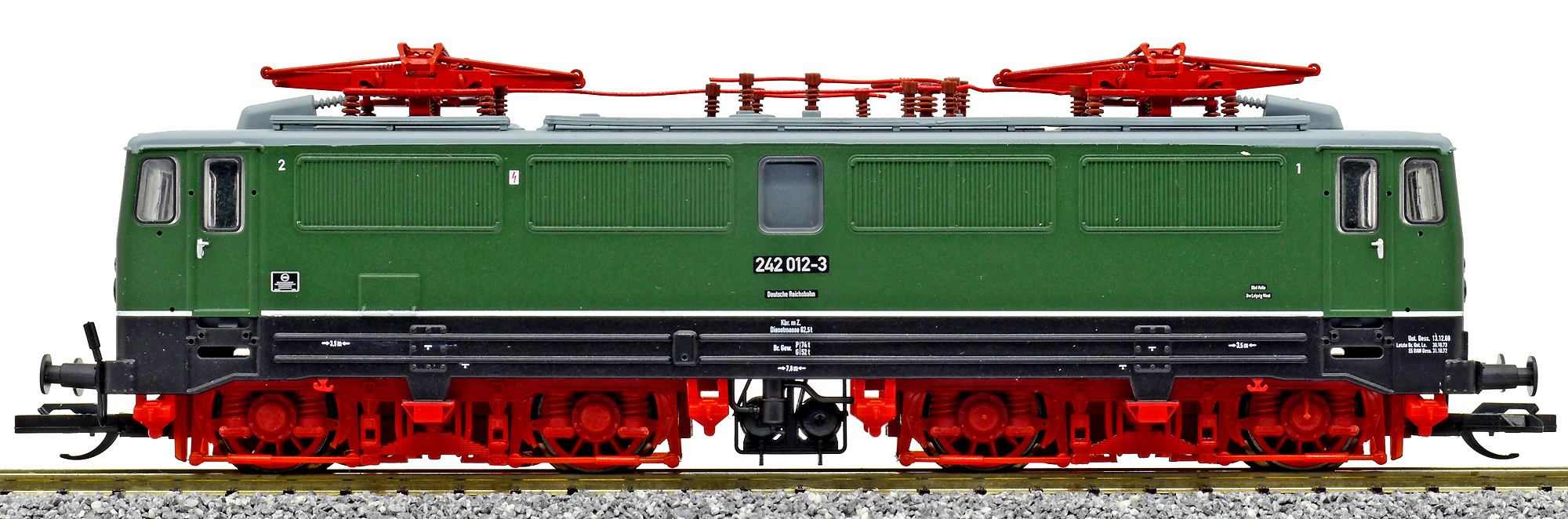 Kód   500523  [Lokomotivy] → [Elektrické] → [BR 242] → 500523: elektrická lokomotiva zelená s černým rámem, šedá střecha a červené podvozky