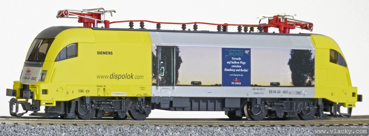 Popis   elektricKá lokomotiva žlutá s reklamou PEG (Prignitzer Eisenbahn GmbH)
