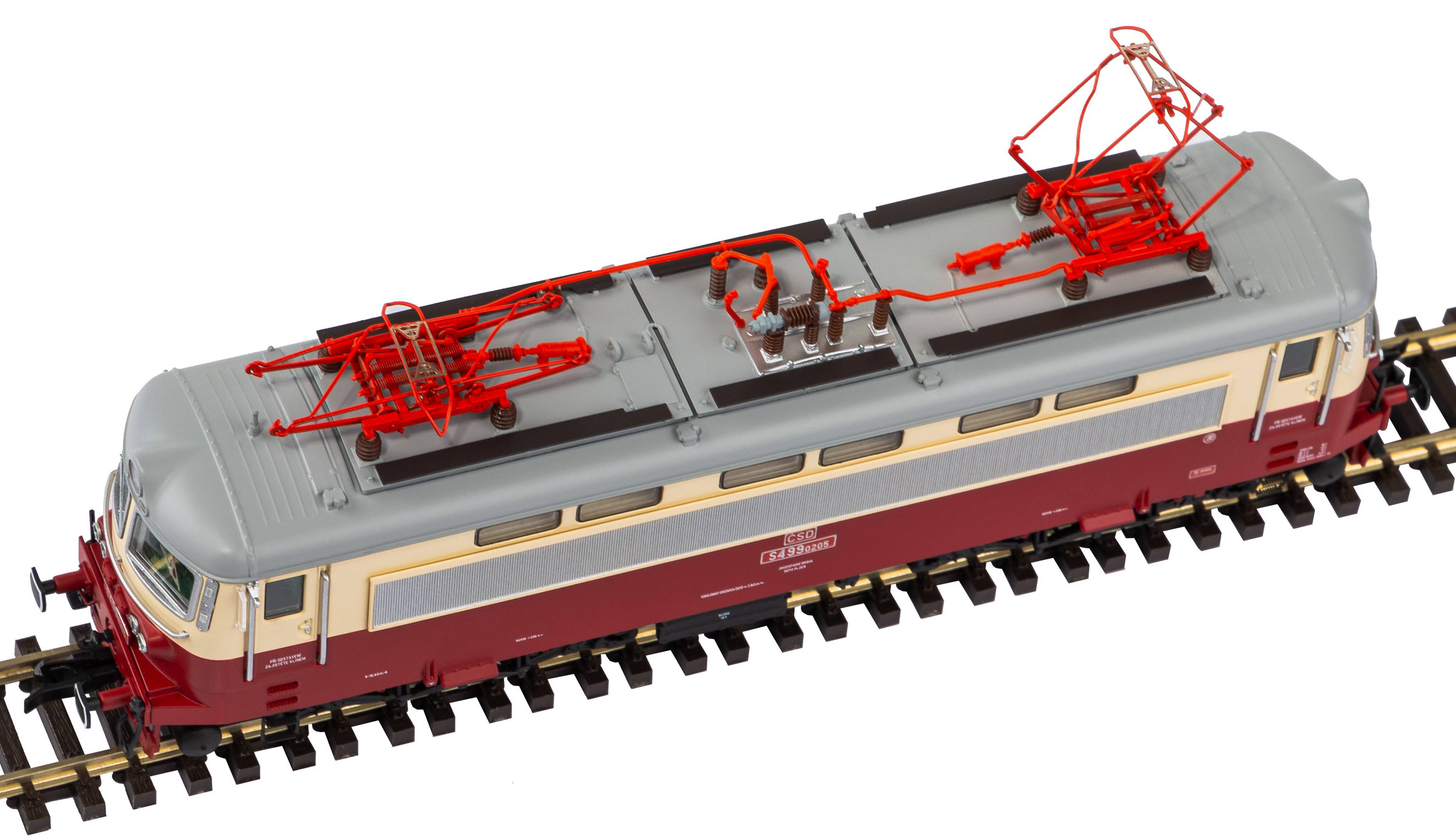 Popis   elektrická lokomotiva červená-slonová kost, šedá střecha a červené pantografy