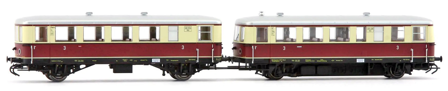 Kód   1351404  [Lokomotivy] → [Motorové vozy a jednotky] → [VT 135] → 1351404: červený-slonová kost s šedou střechou, motorový vůz a přívěsný vůz
