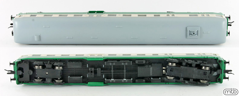 Popis   motorový vůz zelený-slonová kost s šedou střechou, výstražný pruh na čelech