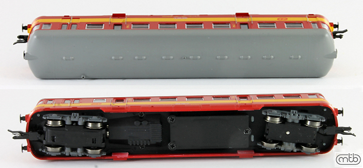 Popis   motorový vůz červený s výstražným pruhem a s šedou střechou