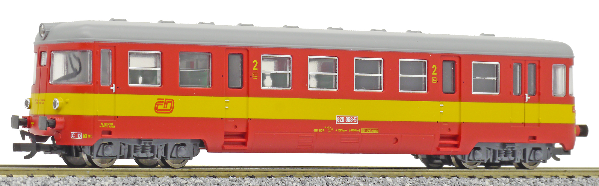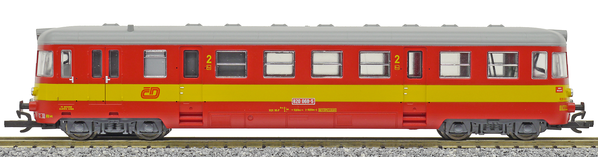 Kód   CSD-820-045  [Lokomotivy] → [Motorové vozy a jednotky] → [M240.0 (820)] → CSD-820-045: motorový vůz červený-slonová kost s šedou střechou, výstražný pruh na čelech