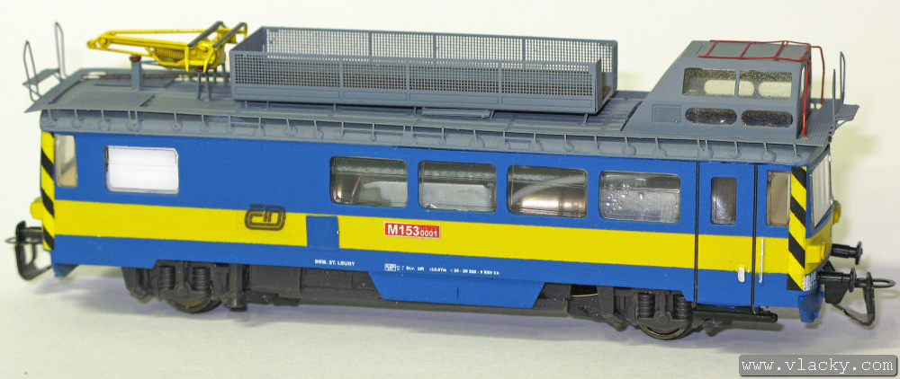 motorový vůz na opravu vrchního vedení modrý s výstražným žlutým pruhem