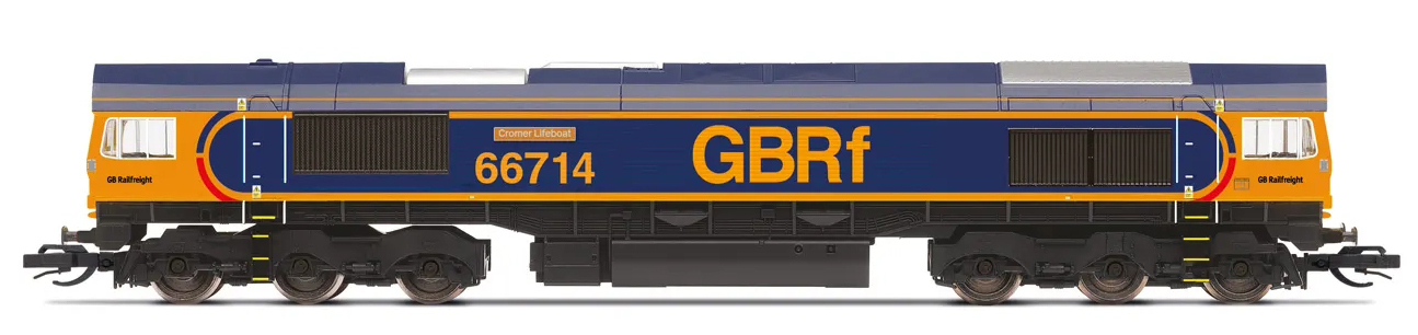 dieselová lokomotiva modrá-oranžová, šedá střecha a černý pojezd „Cromer Lifeboat“