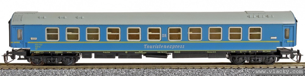 | modrý se dvěma žlutými proužky a šedou střechou "Touristenexpress" |