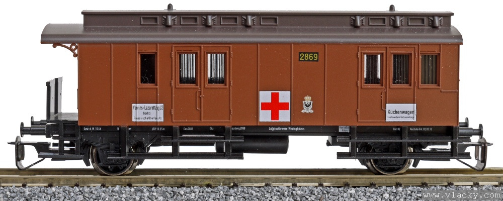 červenohnědý vůz s hnědou střechou „Küchenwagen“