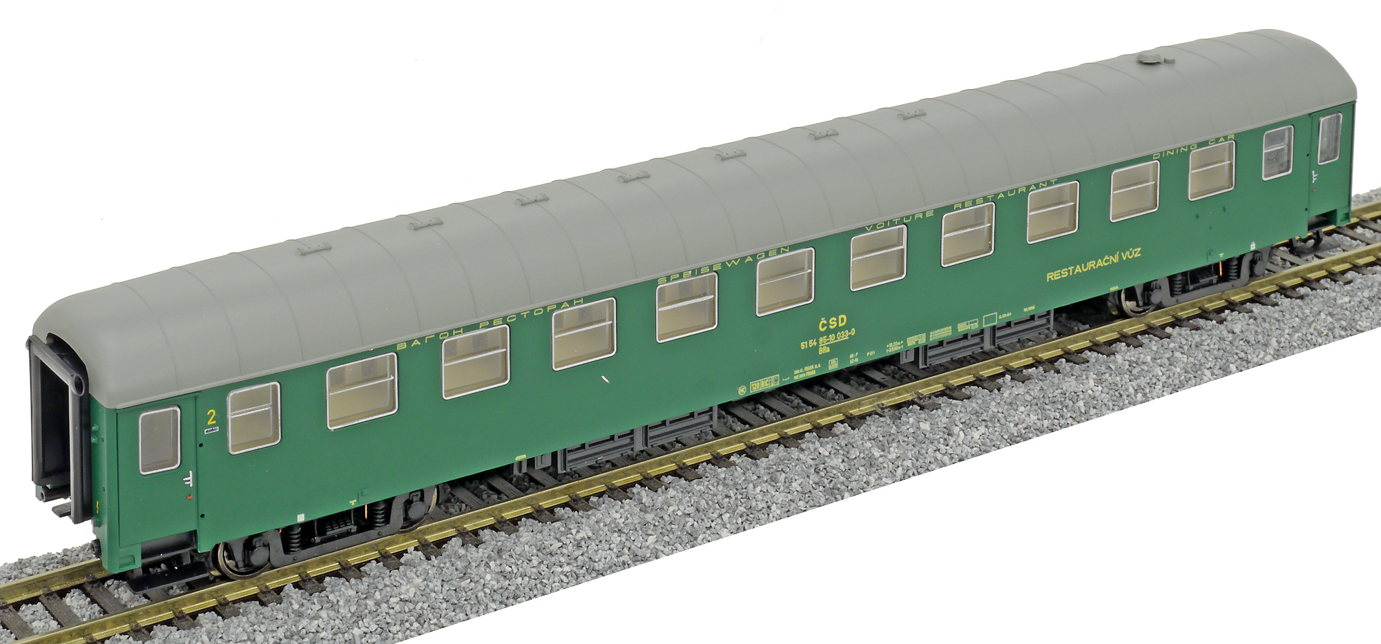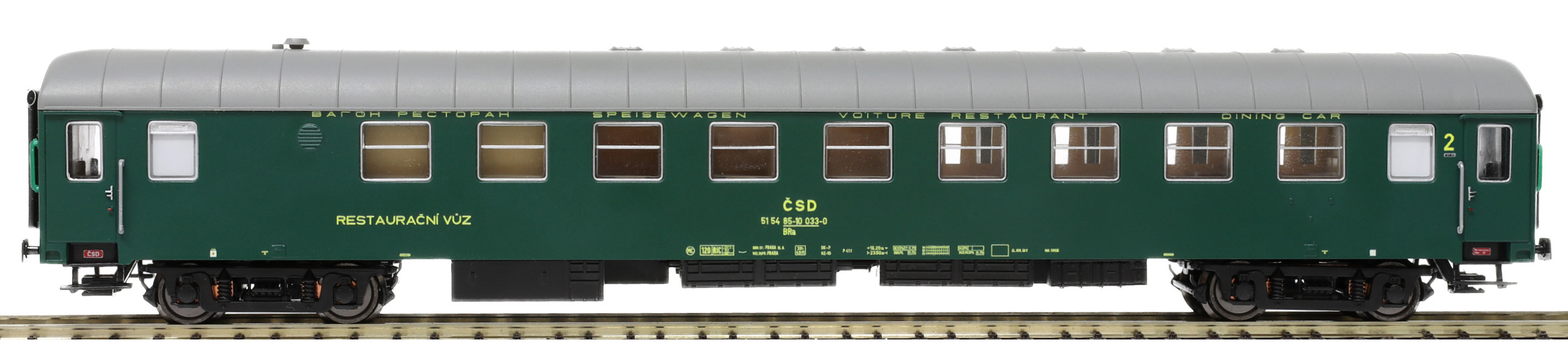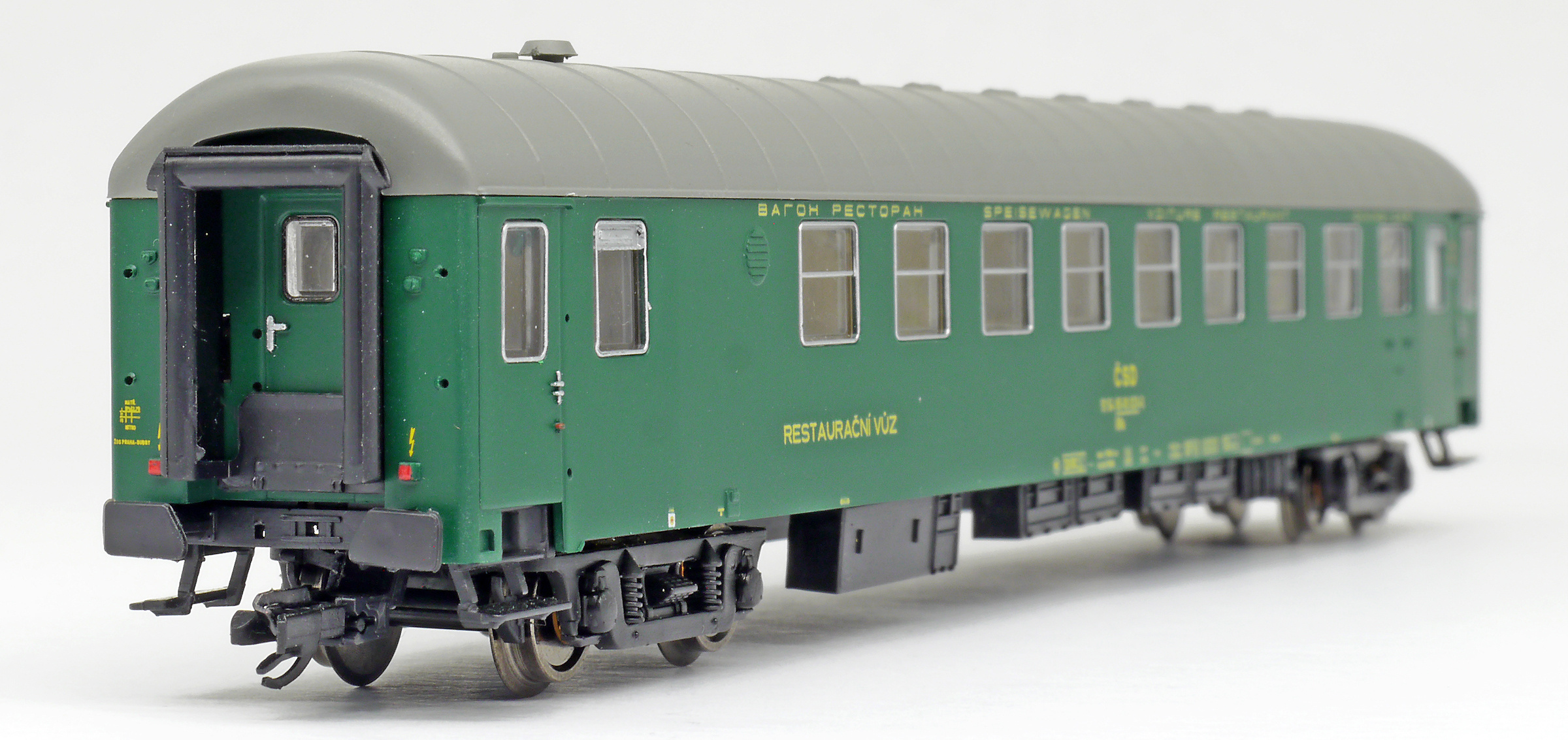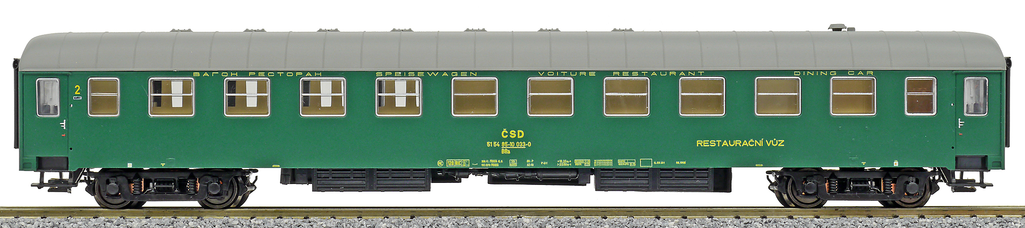 | restaurační vůz zelený s šedou střechou 2. tř., Praha |