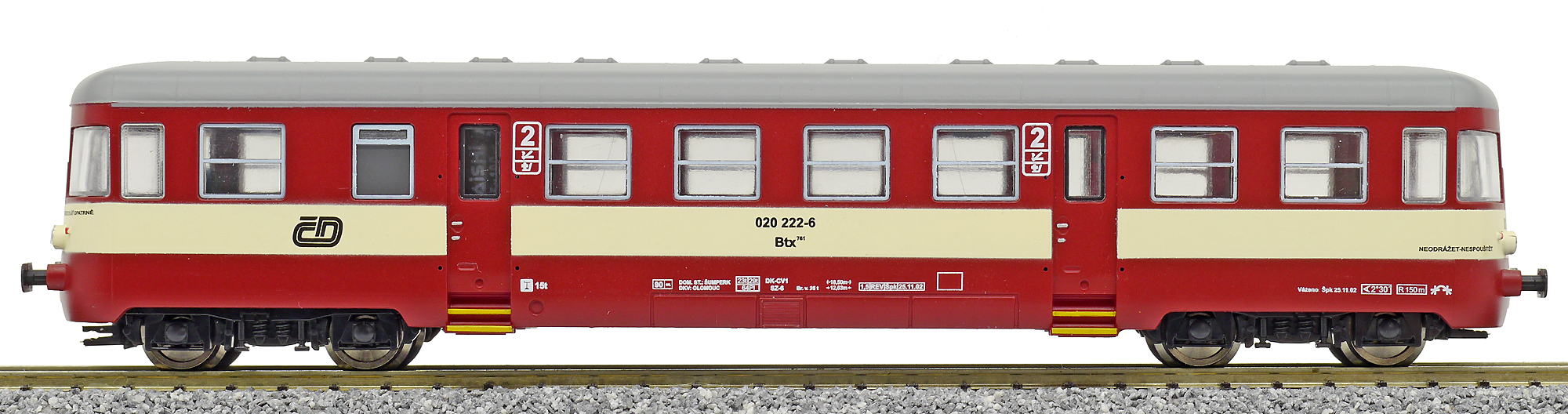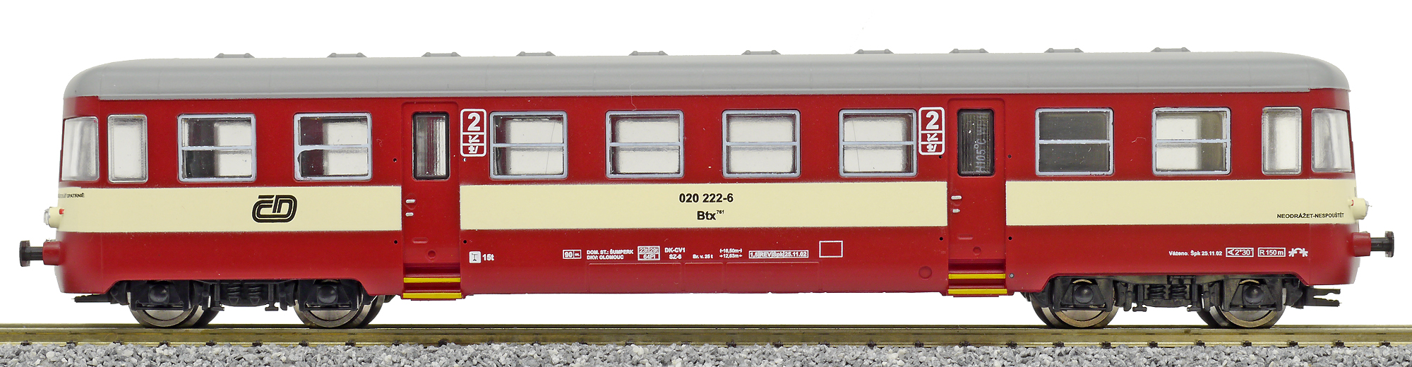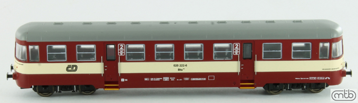Kód   CD-BDdtx-005  [Osobní vozy] → [Spěšné a osobní] → [4-osé Balm, Bix, Btx] → CD-BDdtx-005: osobní vůz červený-slonová kost s šedou střechou se zavazadlovým oddílem 2. tř.