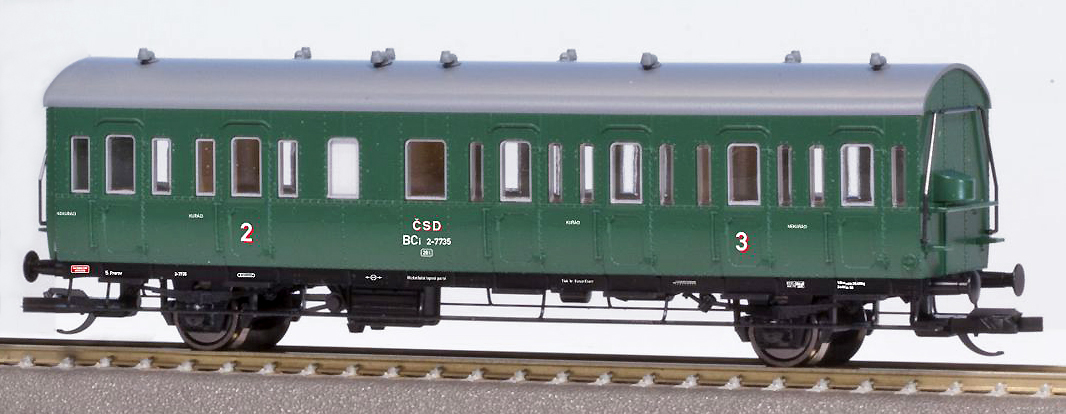 | oddílový osobní vůz zelený s šedou střechou 2./3. tř. |