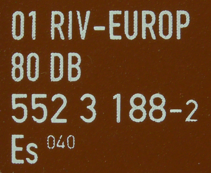 | • 01 80 552 3 188-2 | → | nákladní, nezávislé nápravy, pevný rozchod, ve vlastnictví železniční správy, RIV, EUROP/IF |
