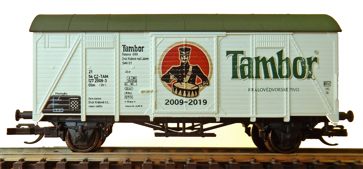 | krytý nákladní vůz bílý se zelenou střechou „Tambor - Královédvorské pivo“ |