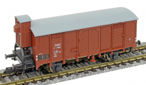 Kód   113921  [Nákladní vozy] → [Kryté] → [2-osé s nízkou střechou] → 113921: krytý nákladní vůz červenohnědý s černou střechou
