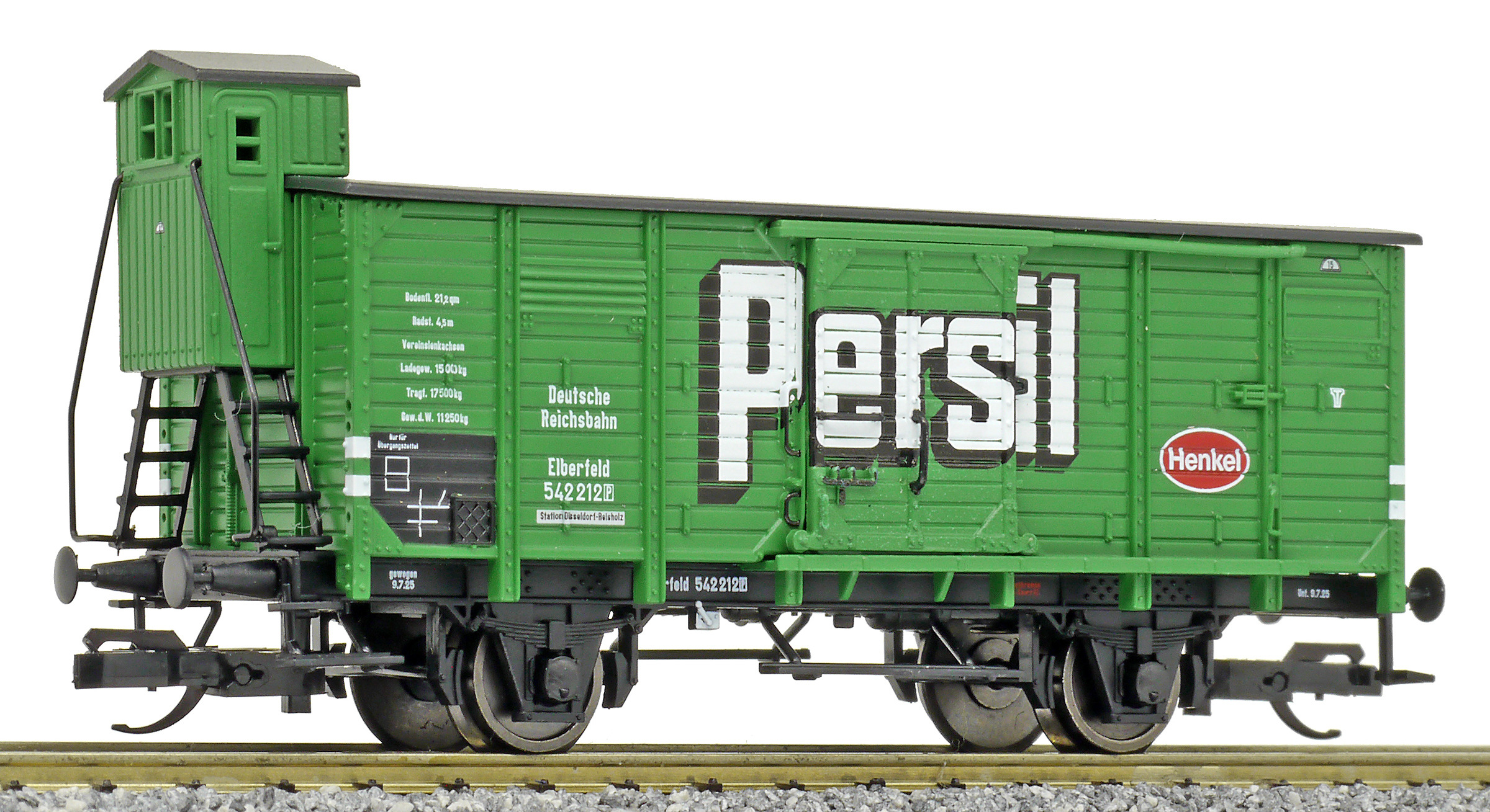 | krytý nákladní vůz zelený s černou střechou a s brzdařskou budkou „Persil“ |