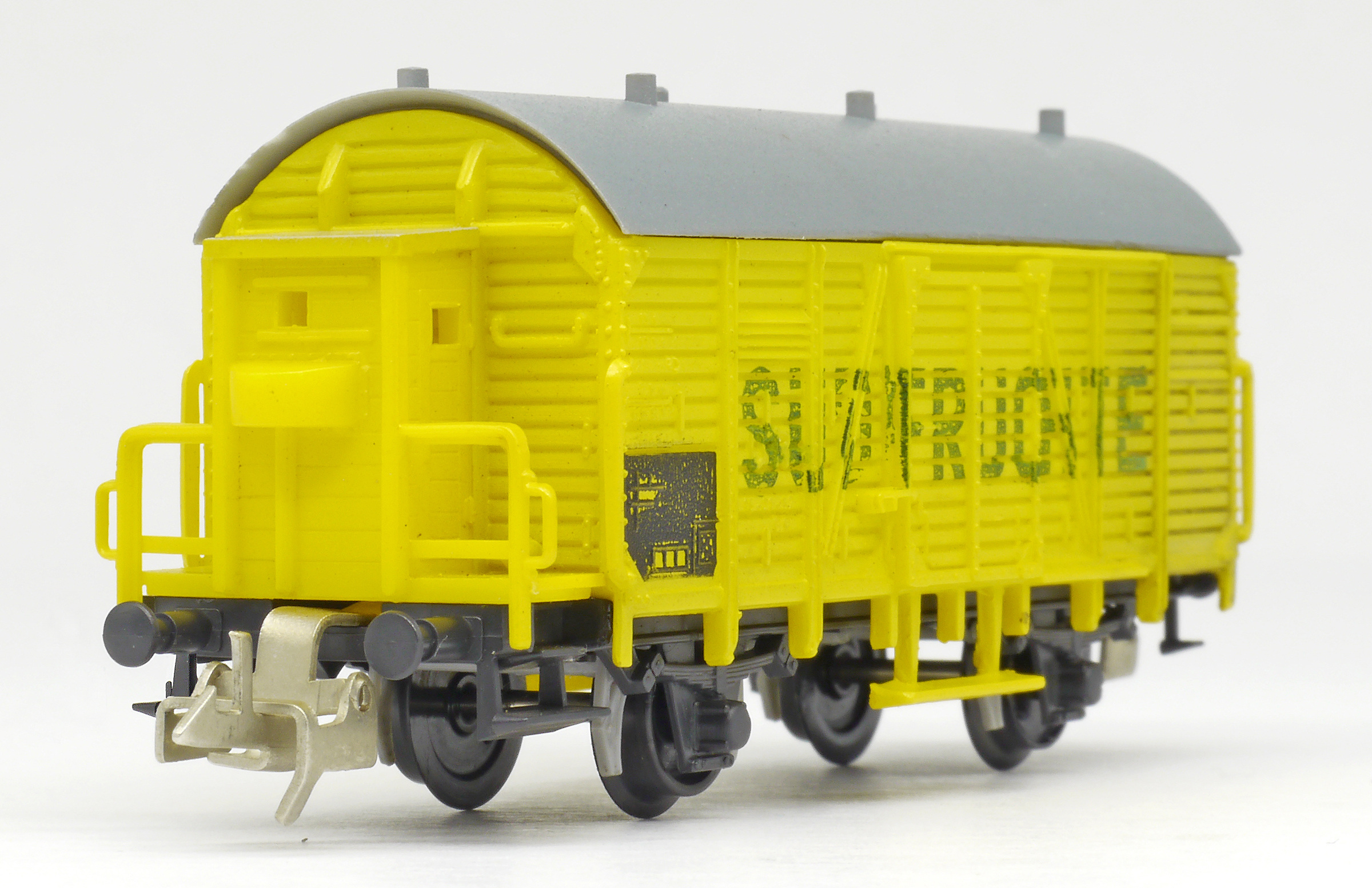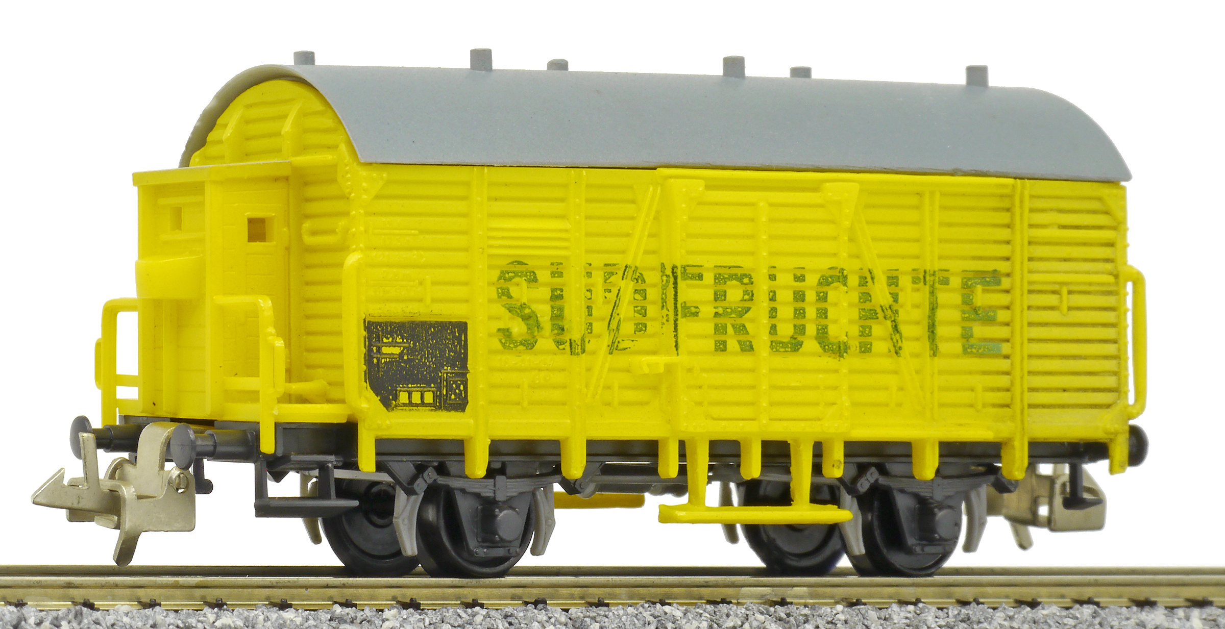 | nákladní chladící vůz žlutý s šedou střechou a s brzdařskou „Südfrüchte“ |