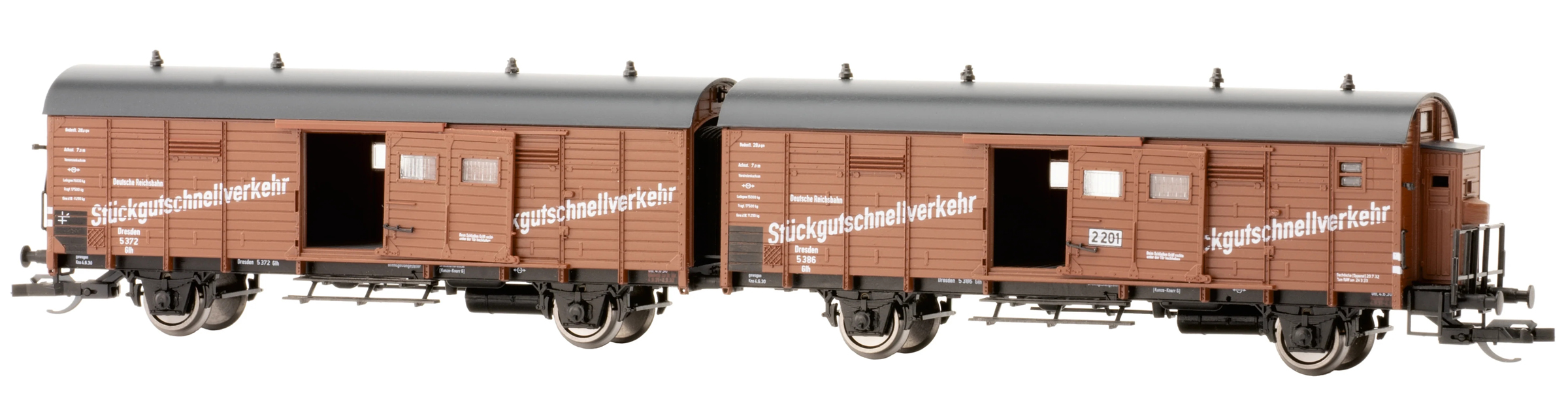 | dvoudílná jednotka červenohnědá s černou střechou a s brzdařskou plošinou „Stückgutschnellverkehr“ |