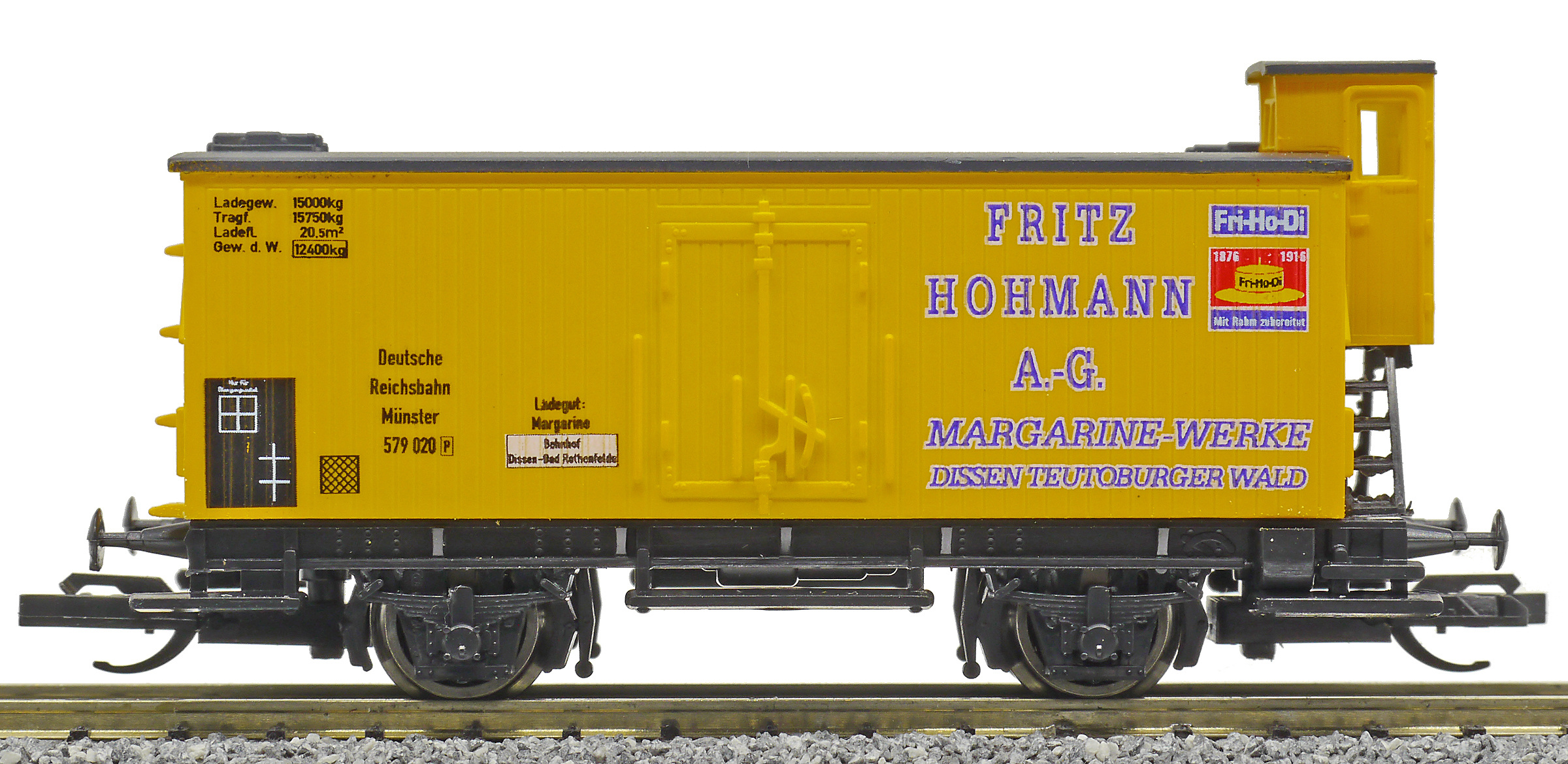 | krytý nákladní vůz žlutý s šedou střechou a brzdařskou budkou „Fritz Hohmann“ |