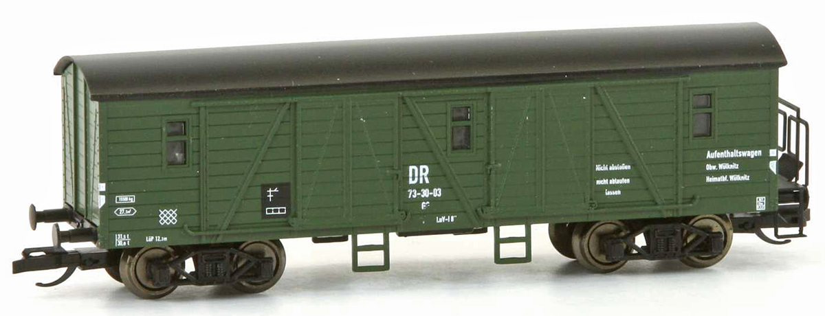 | krytý nákladní vůz do pracovního vlaku zelený s tmavě šedou střechou |