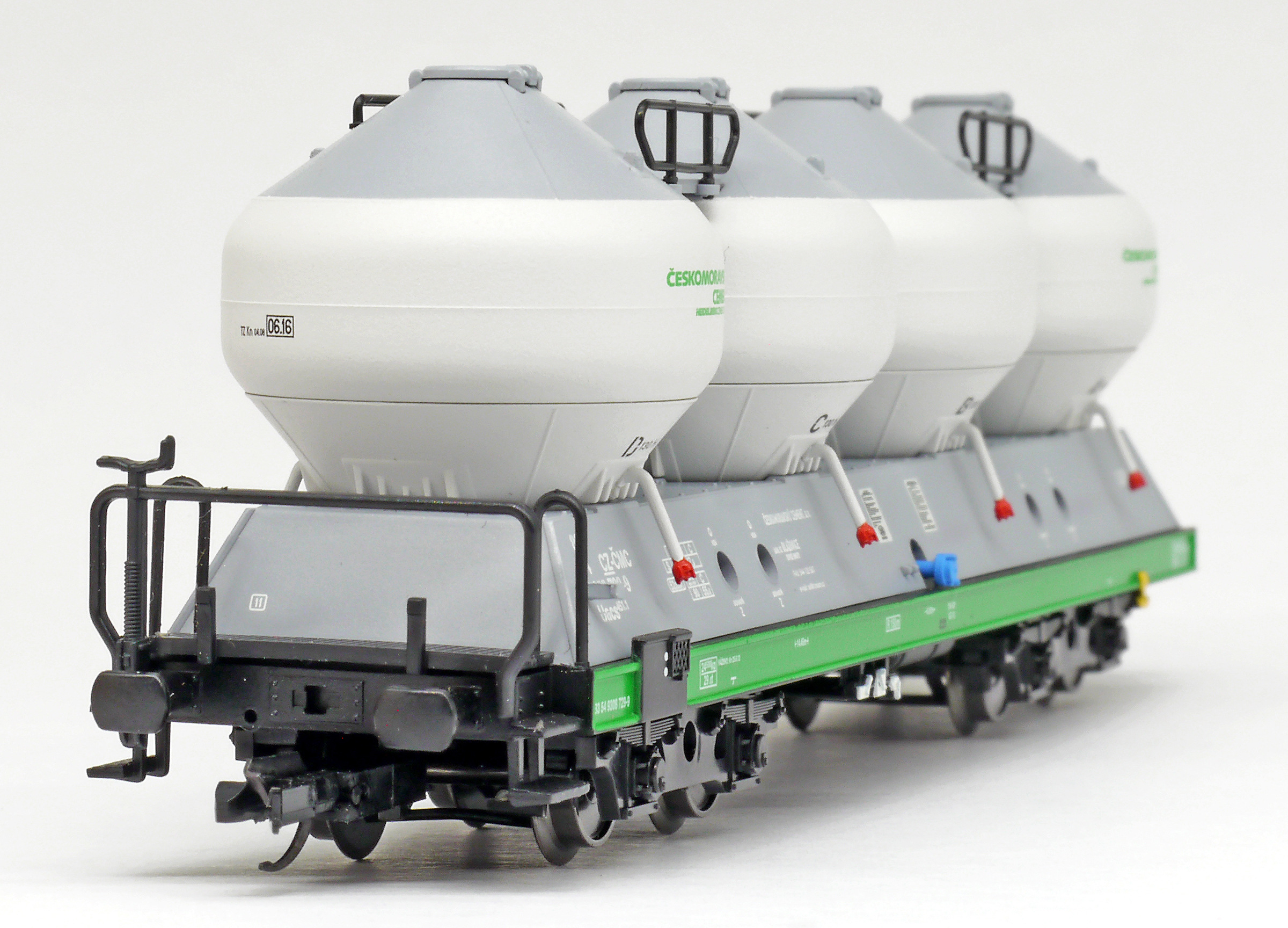 | nákladní samovýsypný vůz šedý se zeleným rámem s šedými nádobami |