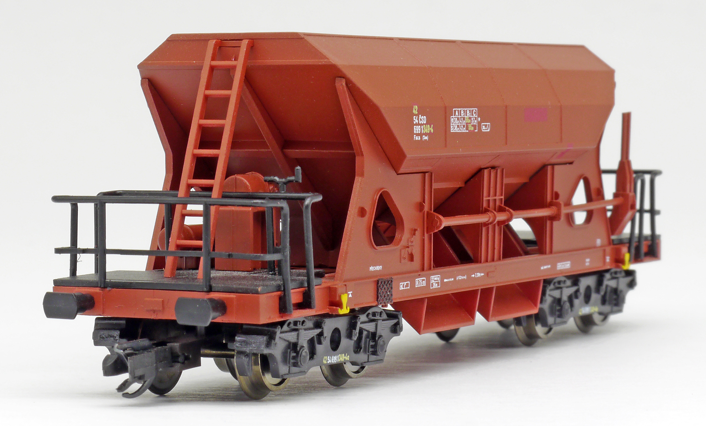| nákladní samovýsypný vůz červenohnědý s černými plošinami |