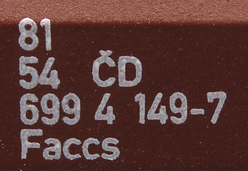 | • 81 54 699 4 149-7 | → | nákladní, s podvozky, ve vlastnictví železniční správy, pro mezinárodní dopravu dle zvláštních umluv |