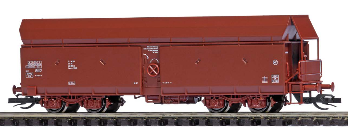 | samovýsypný vůz červenohnědý s uzavřenou brzdařskou plošinou se stříškou |