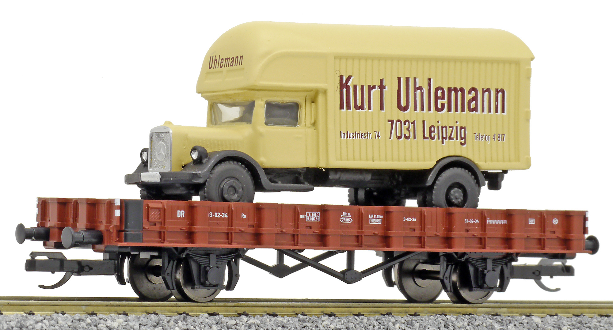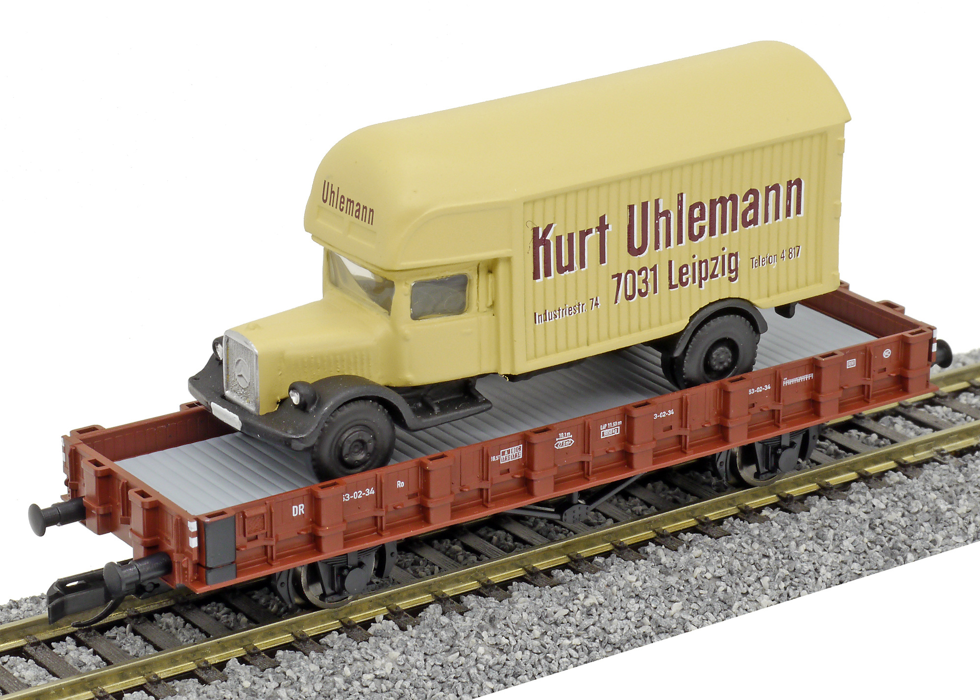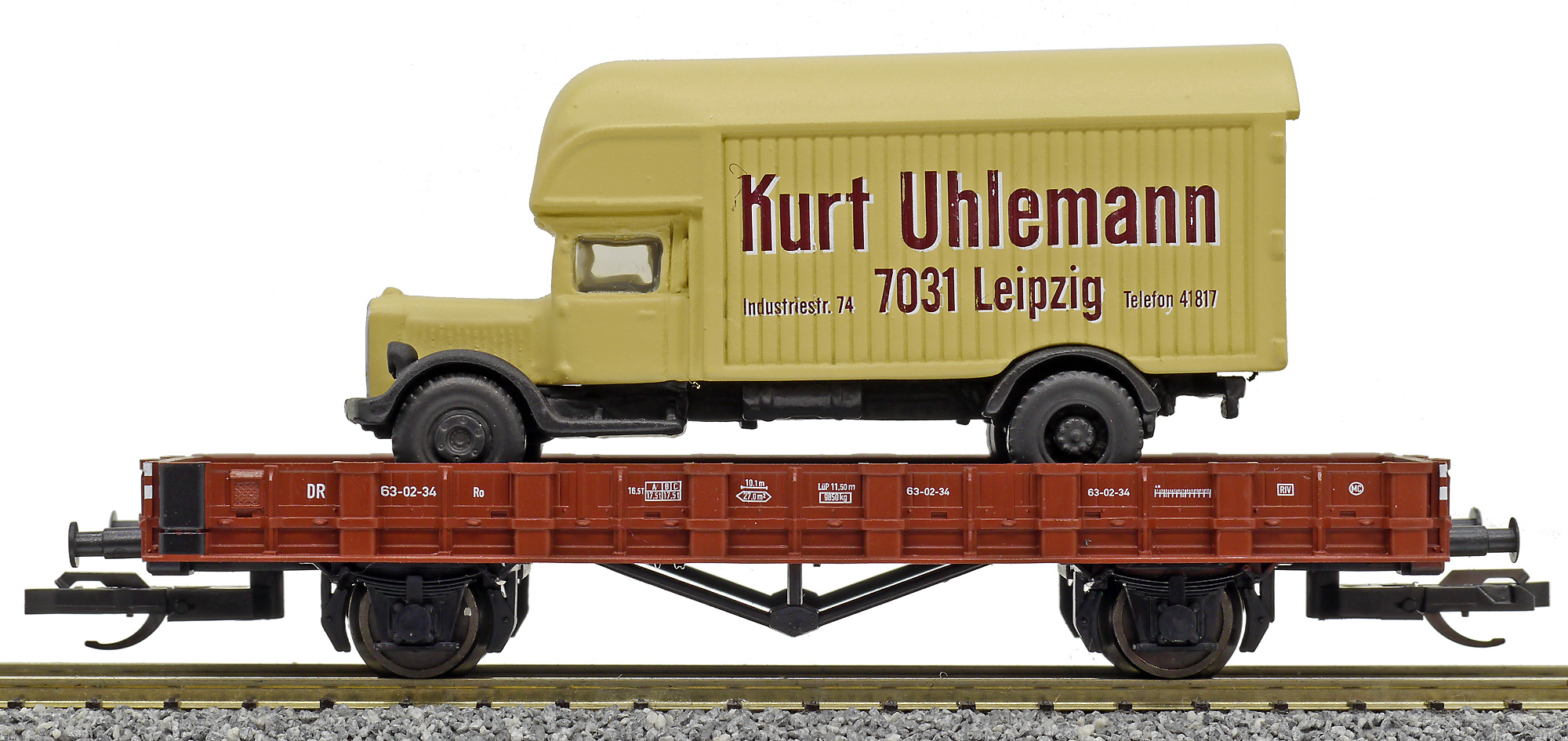 | nízkostěnný vůz červenohnědý s nákladem automobilu „Kurt Uhlemann, Leipzig“ |