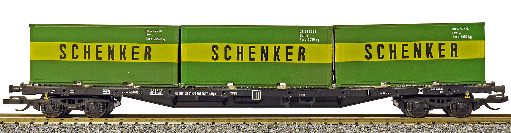 | nákladní plošinový vůz černý se třemi kontejnery 20' „SCHENKER“ |