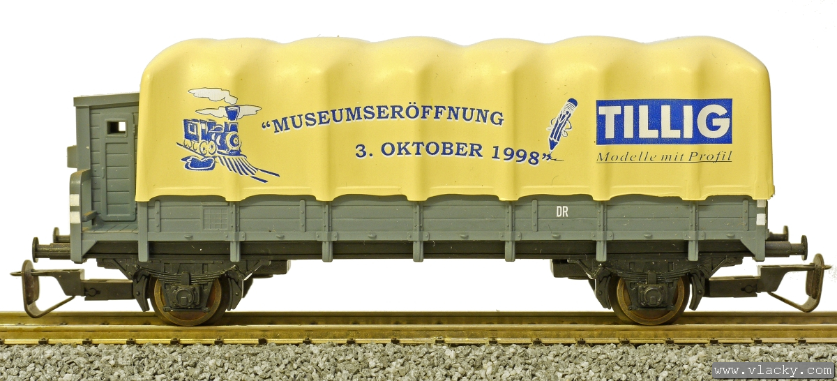 | nízkostěnný vůz šedý s plachtou s reklamním potiskem „Museumseröffnung“ |