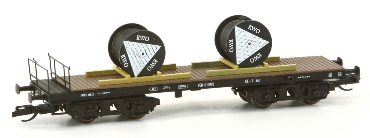 | nákladní plošinový vůz černý s nákladem kabelových cívek |