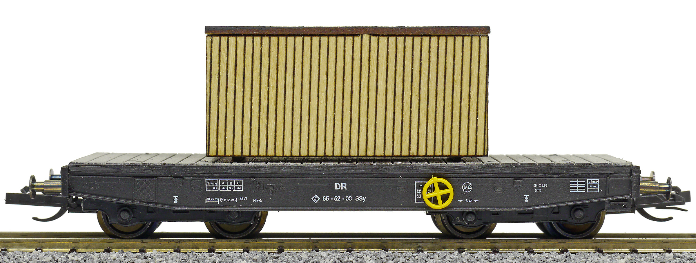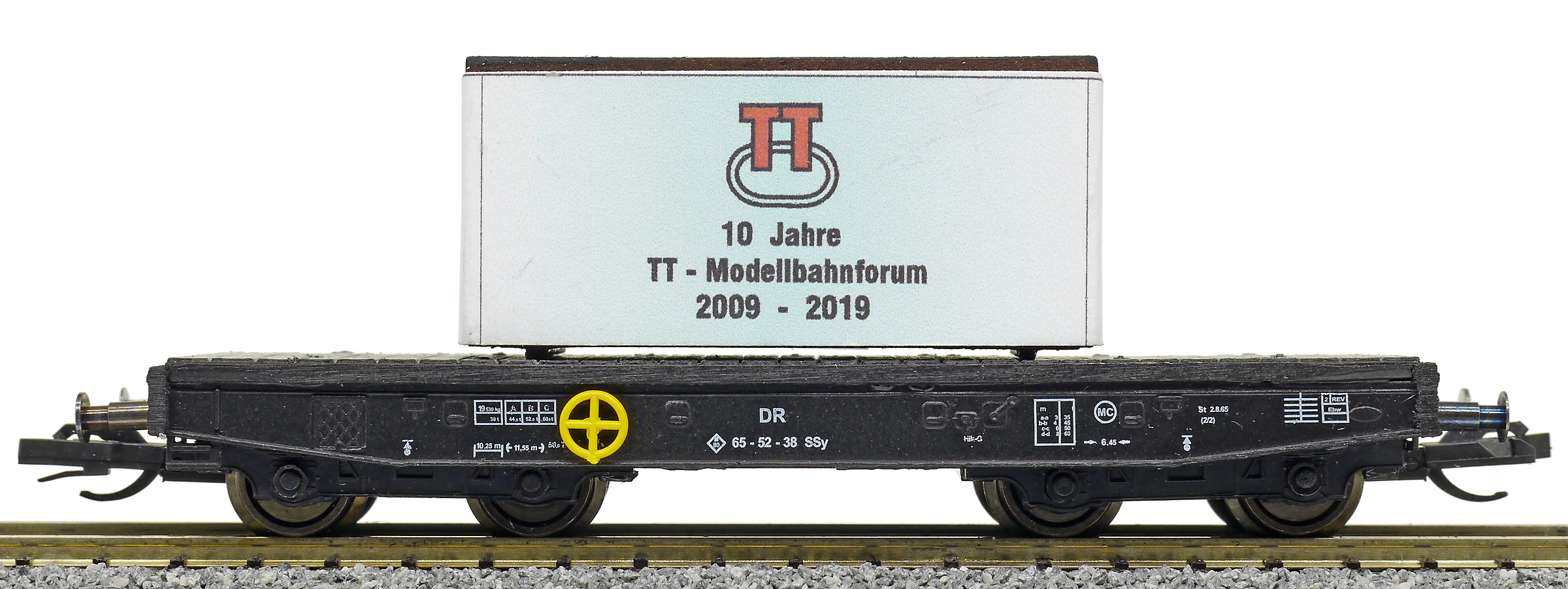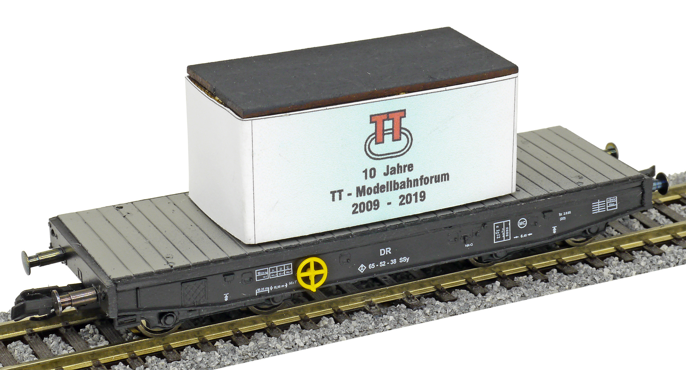 | plošinový nákladní vůz černý s nákladem bedny „10 Jahre TT-Modellbahnforum 2009 - 2019“ |