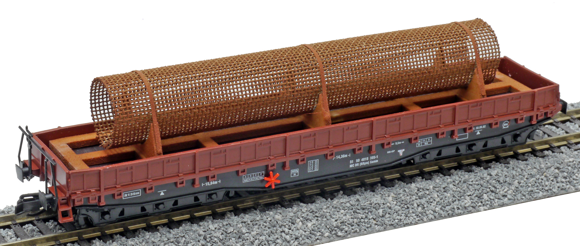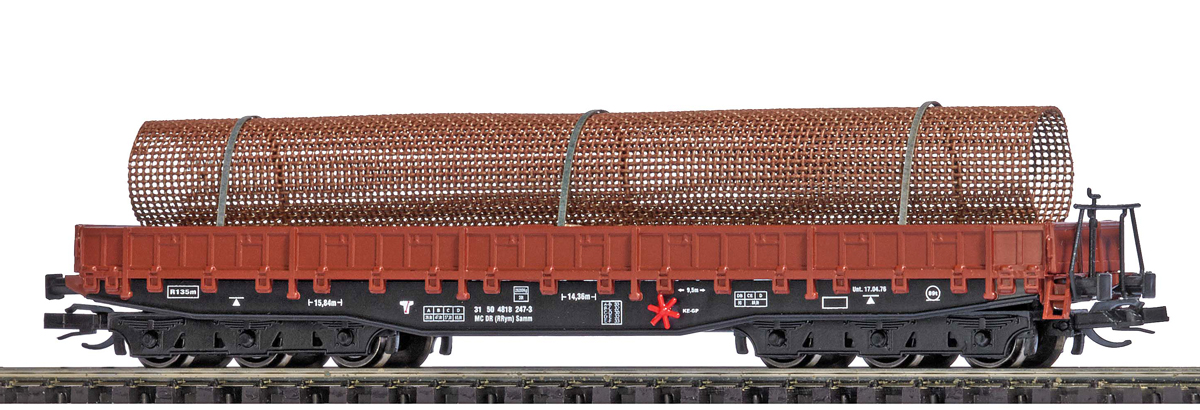 | nízkostěnný vůz červenohnědý s nákladem ocelové sítě do betonu |