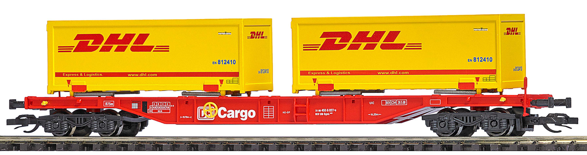 | červený s nákladem dvou žlutých kontejnerů 20' „DHL“ |