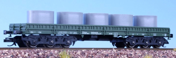 | zelený do stavebního vlaku s nákladem betonových skruží |