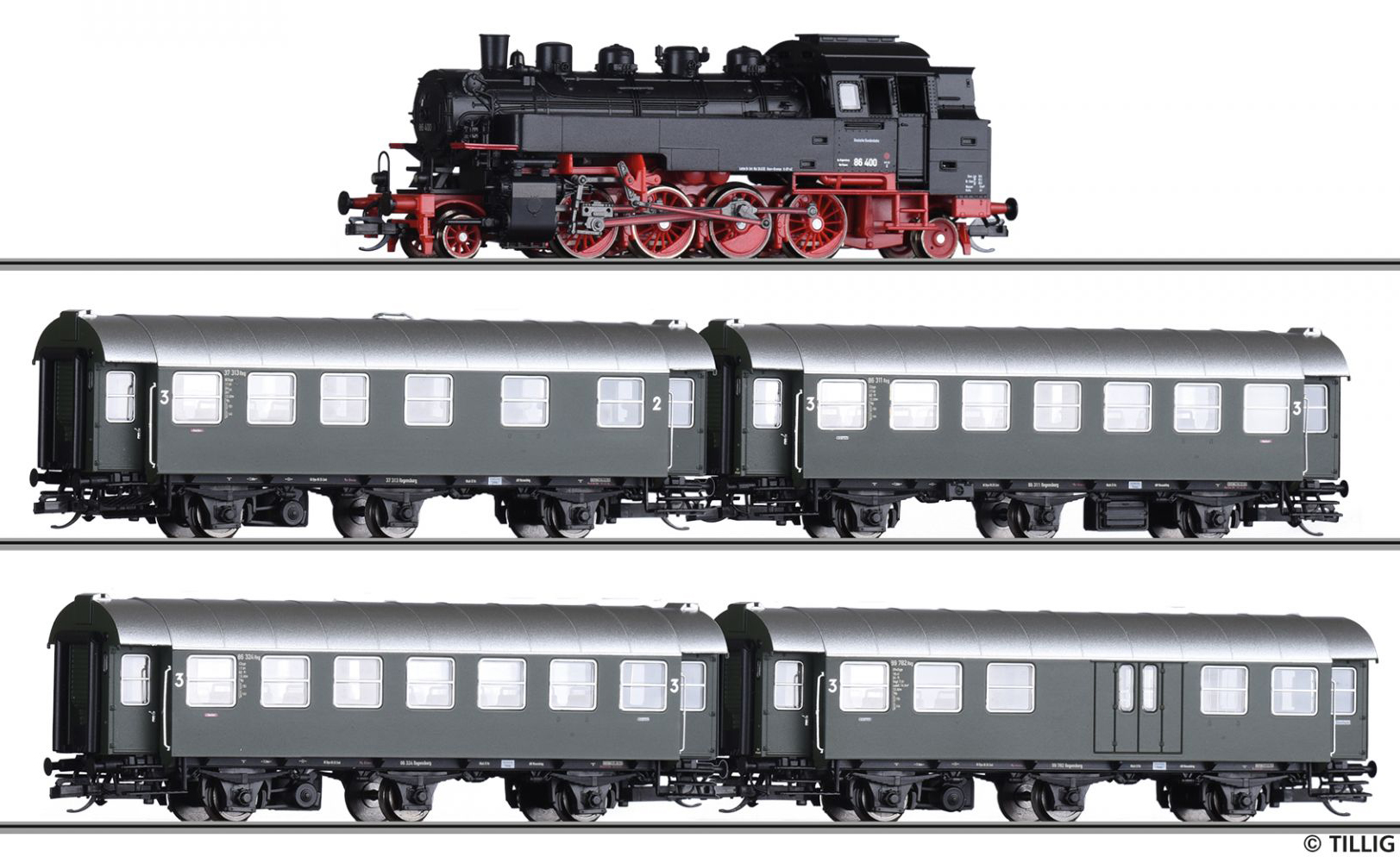 Kód   01110  [Soupravy] → [S lokomotivou] → 01110: set parní lokomotivy BR 89, zavazadlového vozu a dvou osobních vozů