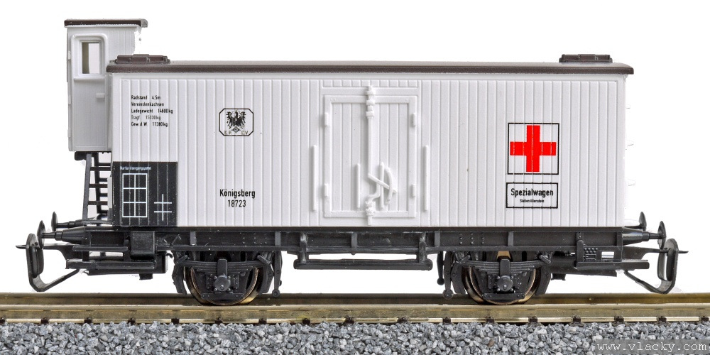 | červenohnědý vůz s hnědou střechou „Krankenwagen Nr. 20“ |