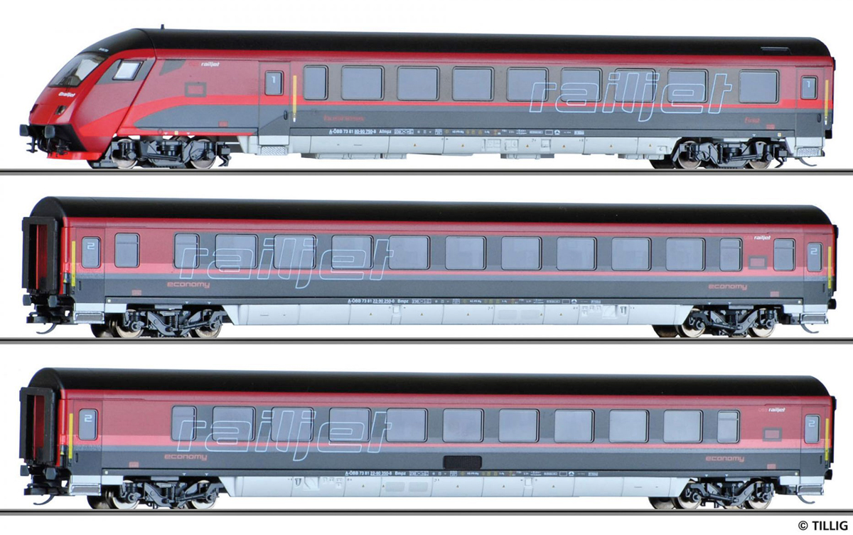| set tří rychlíkových vozů „Railjet“ v barvách ÖBB |