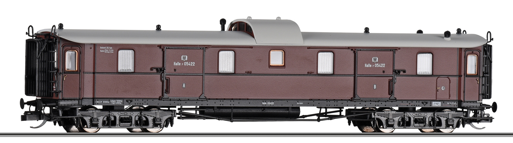 zavazadlový vůz červený s šedou střechou „Preußischer Schnellzug“