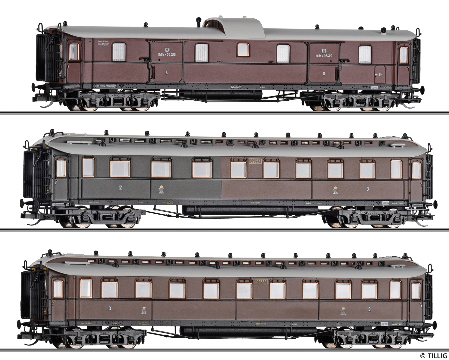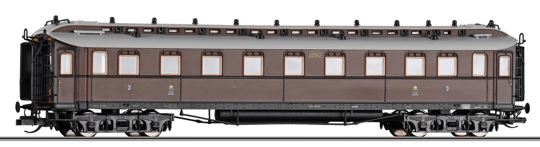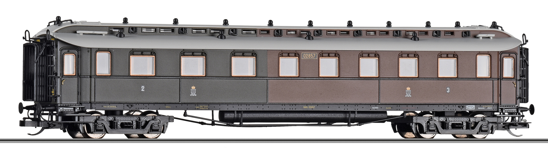 osobní vůz červený s šedou střechou „Preußischer Schnellzug“ 3. tř.