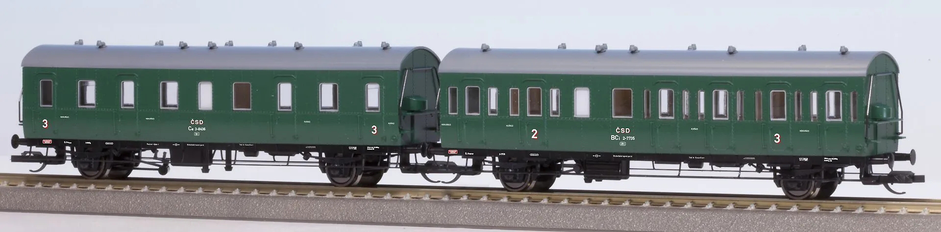 | oddílový osobní vůz zelený s šedou střechou 2./3. tř. |