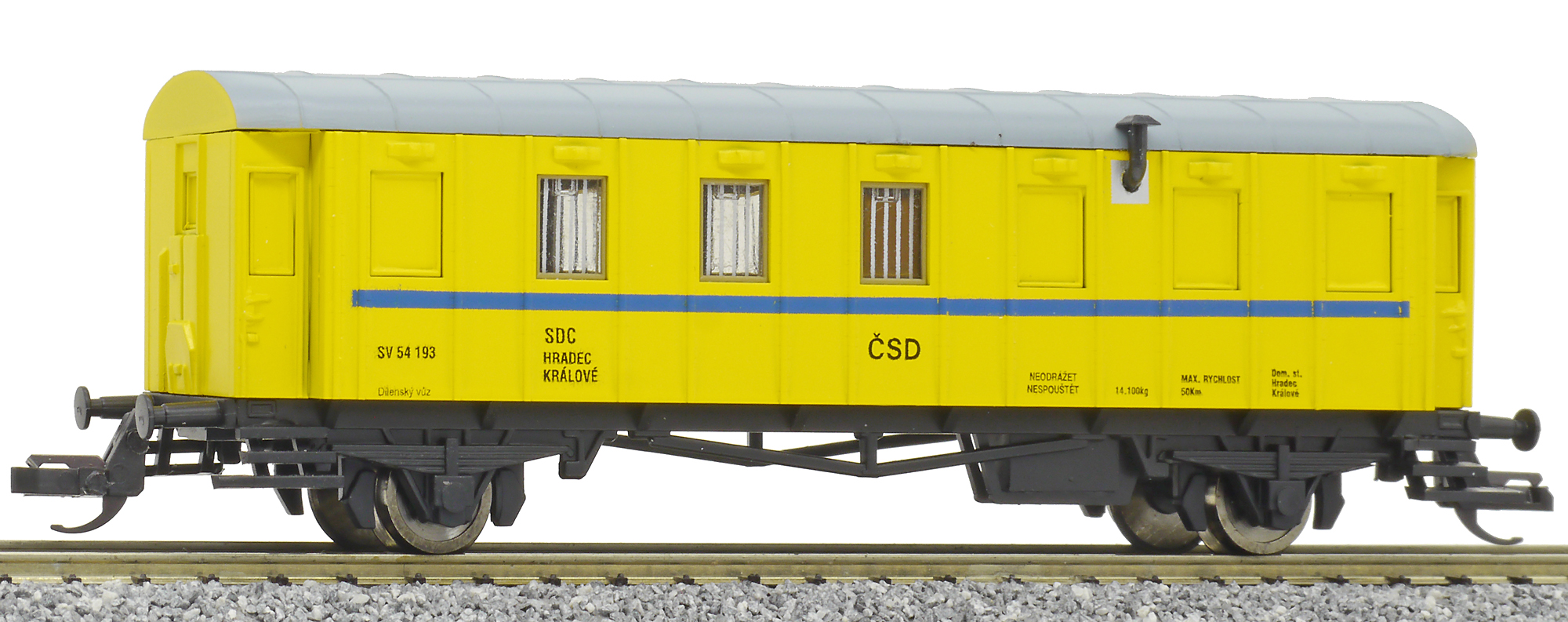 | dílenský vůz žlutý modrým proužkem a šedou střechou |