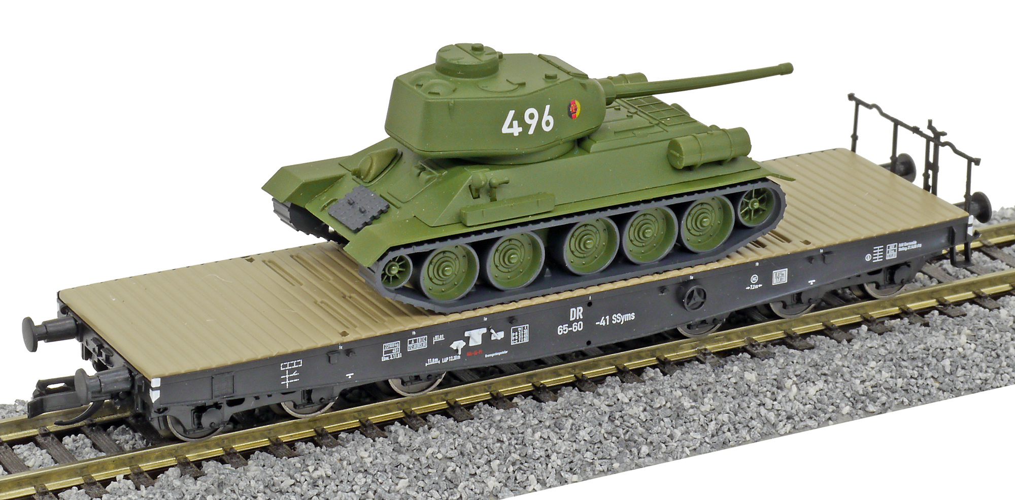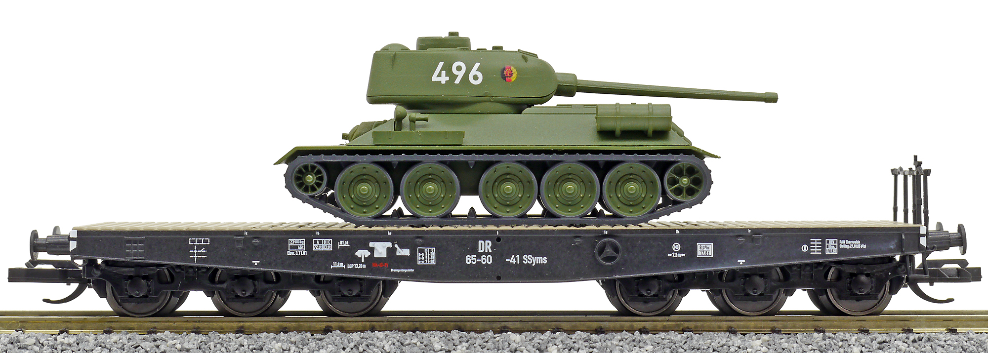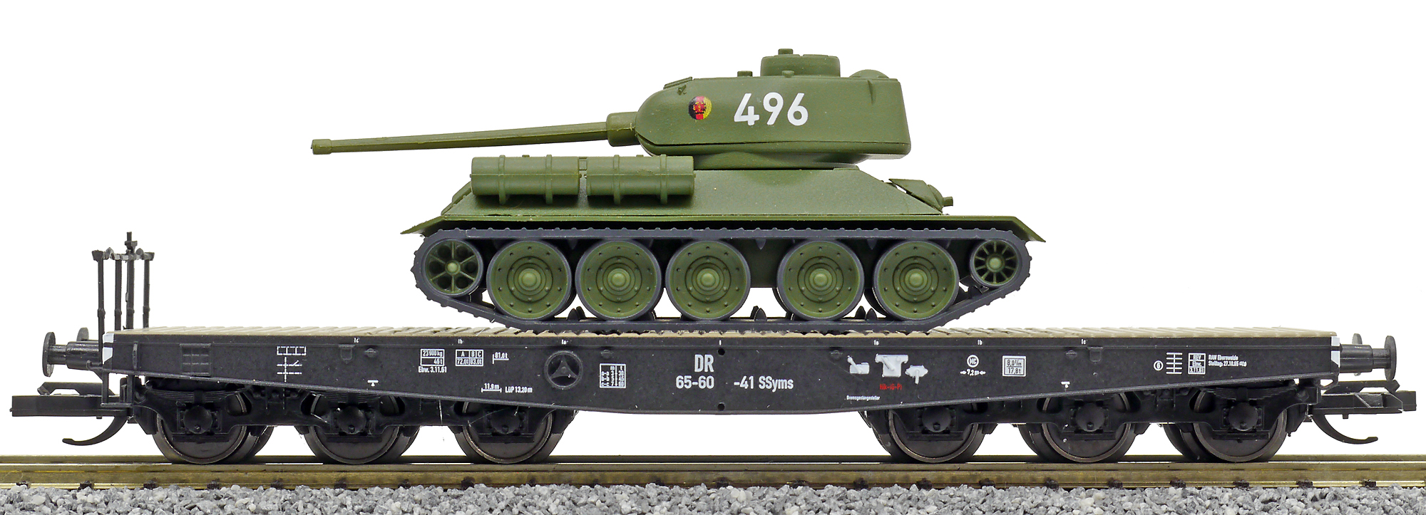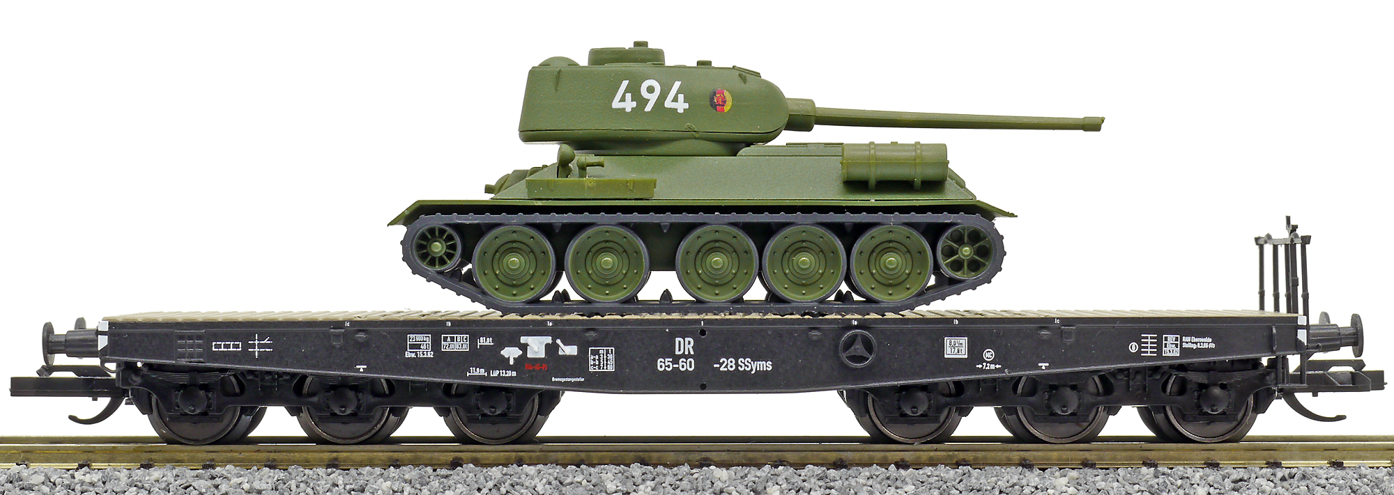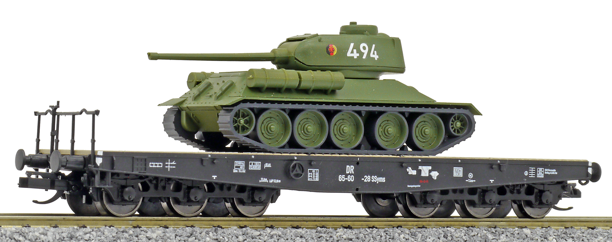Popis   plošinový nákladní vůz černý s nákladem tanku T38/85