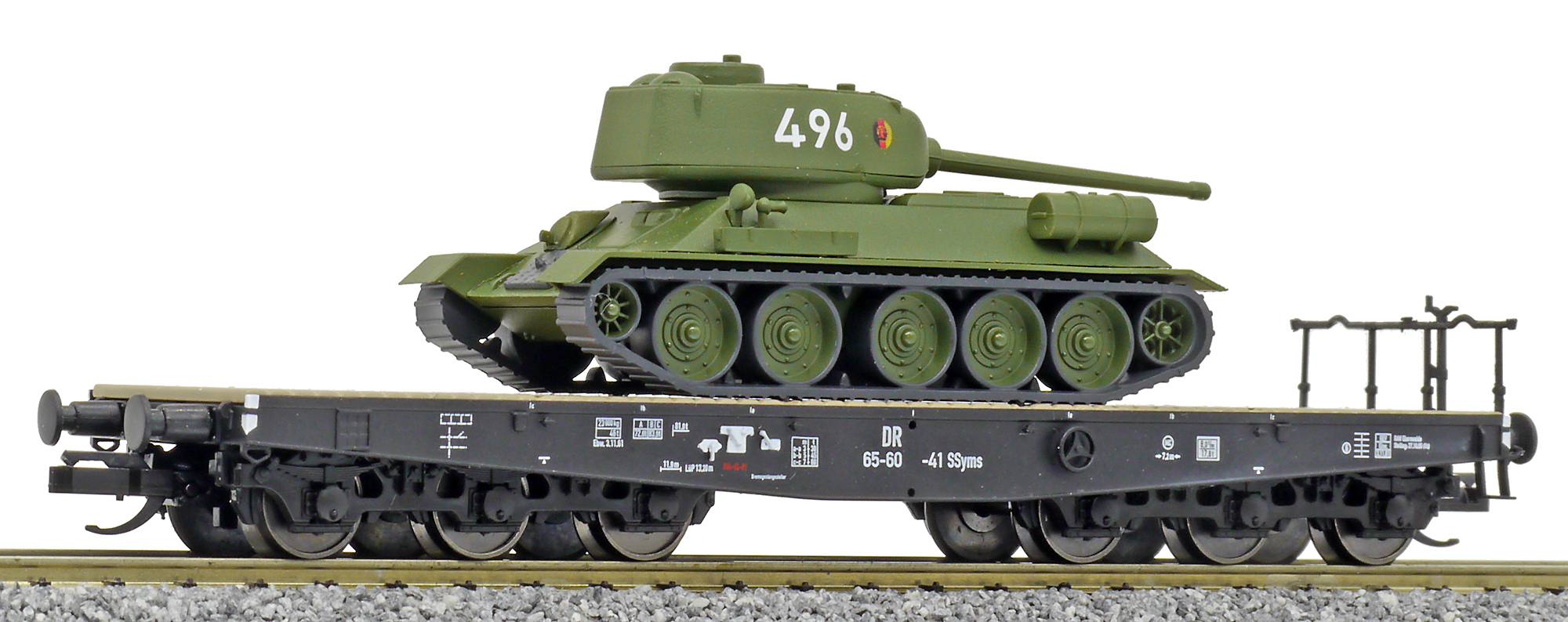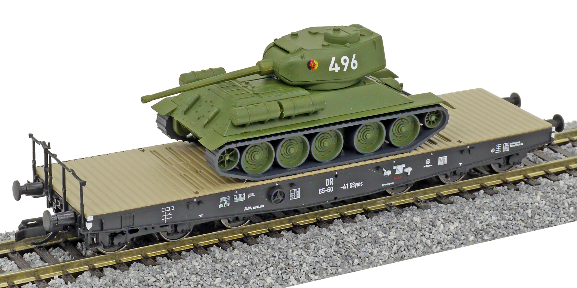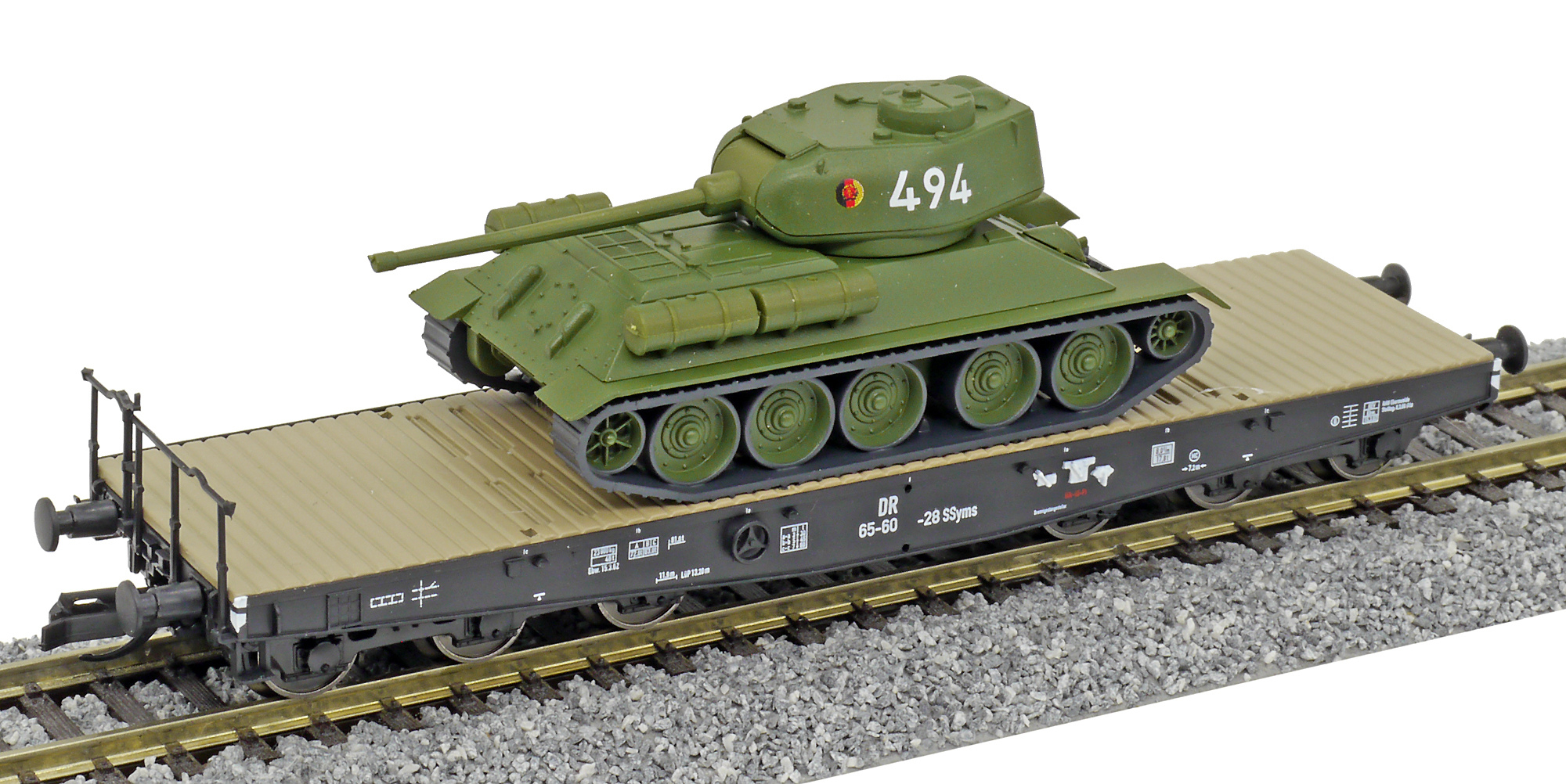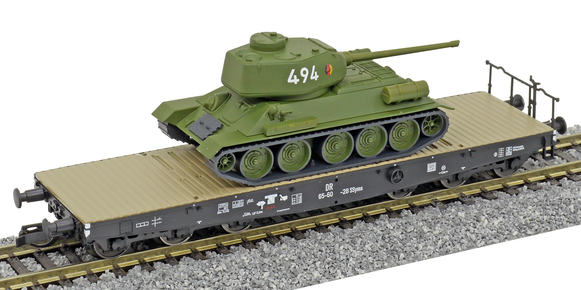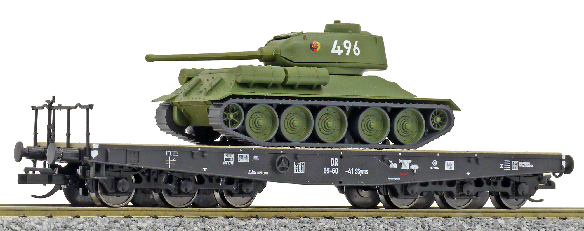 Popis   plošinový nákladní vůz černý s nákladem tanku T38/85