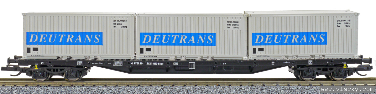 | nákladní plošinový vůz černý se třemi kontejnery „DEUTRANS“ |