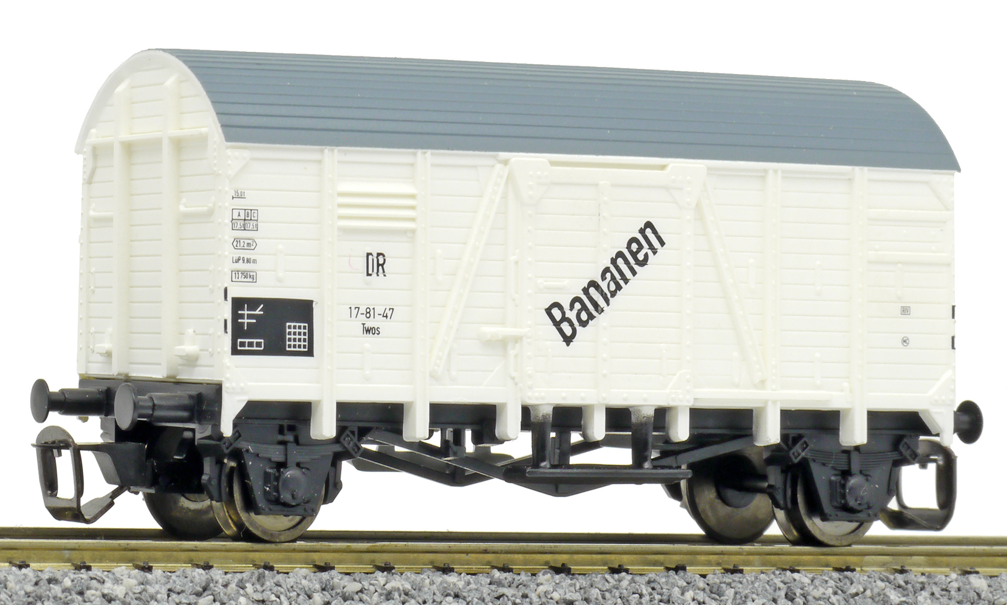| nákladní vůz bílý s tmavě s šedou střechou „Bananen“ |