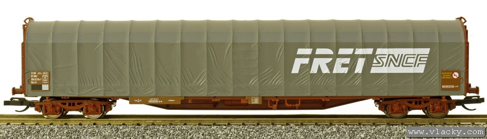 | nízkostěnný nákladní vůz červenohnědý s šedou plachtou „FRET“ |