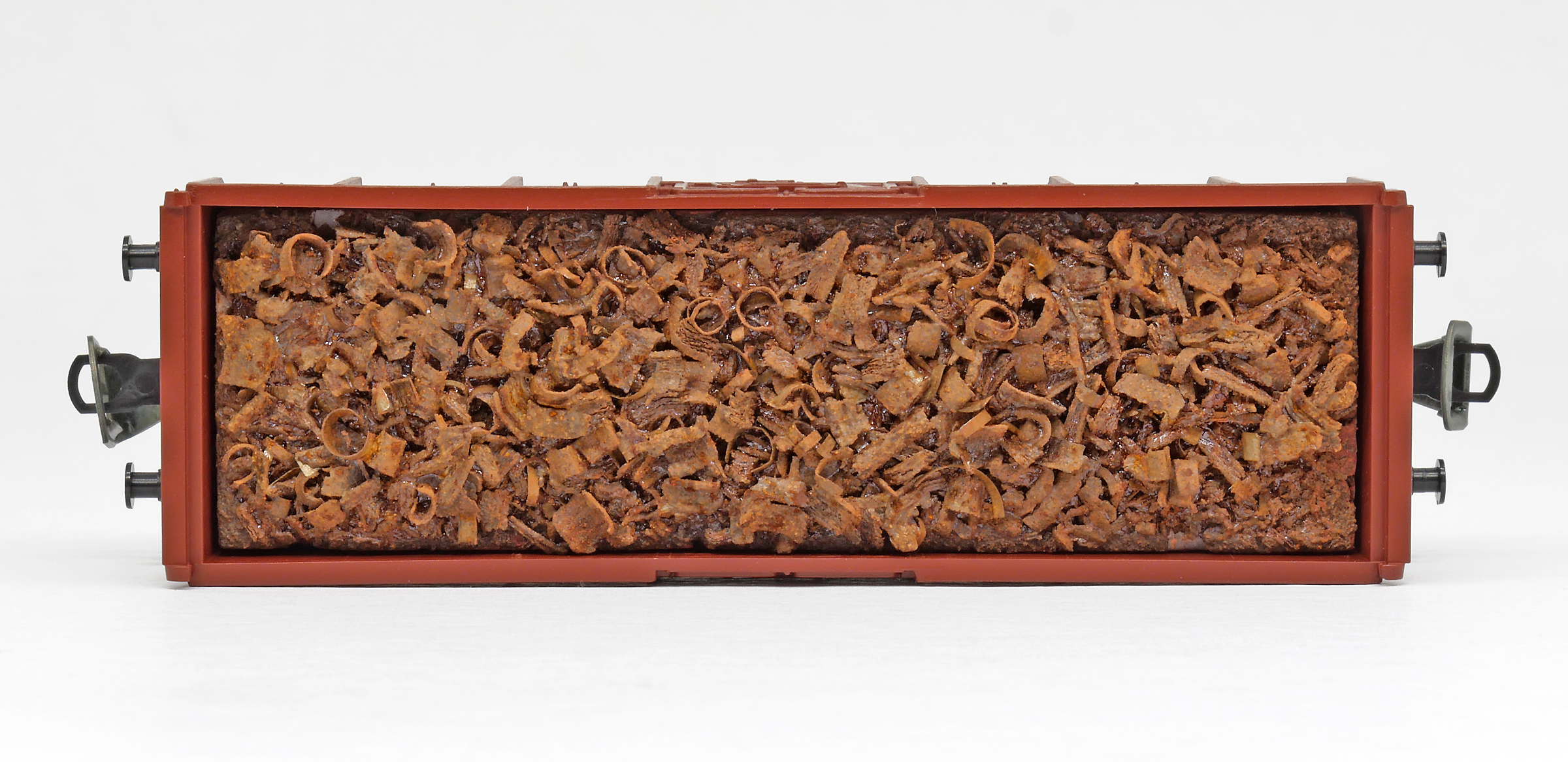 | otevřený nákladní vůz červenohnědý s nákladem šrotu |