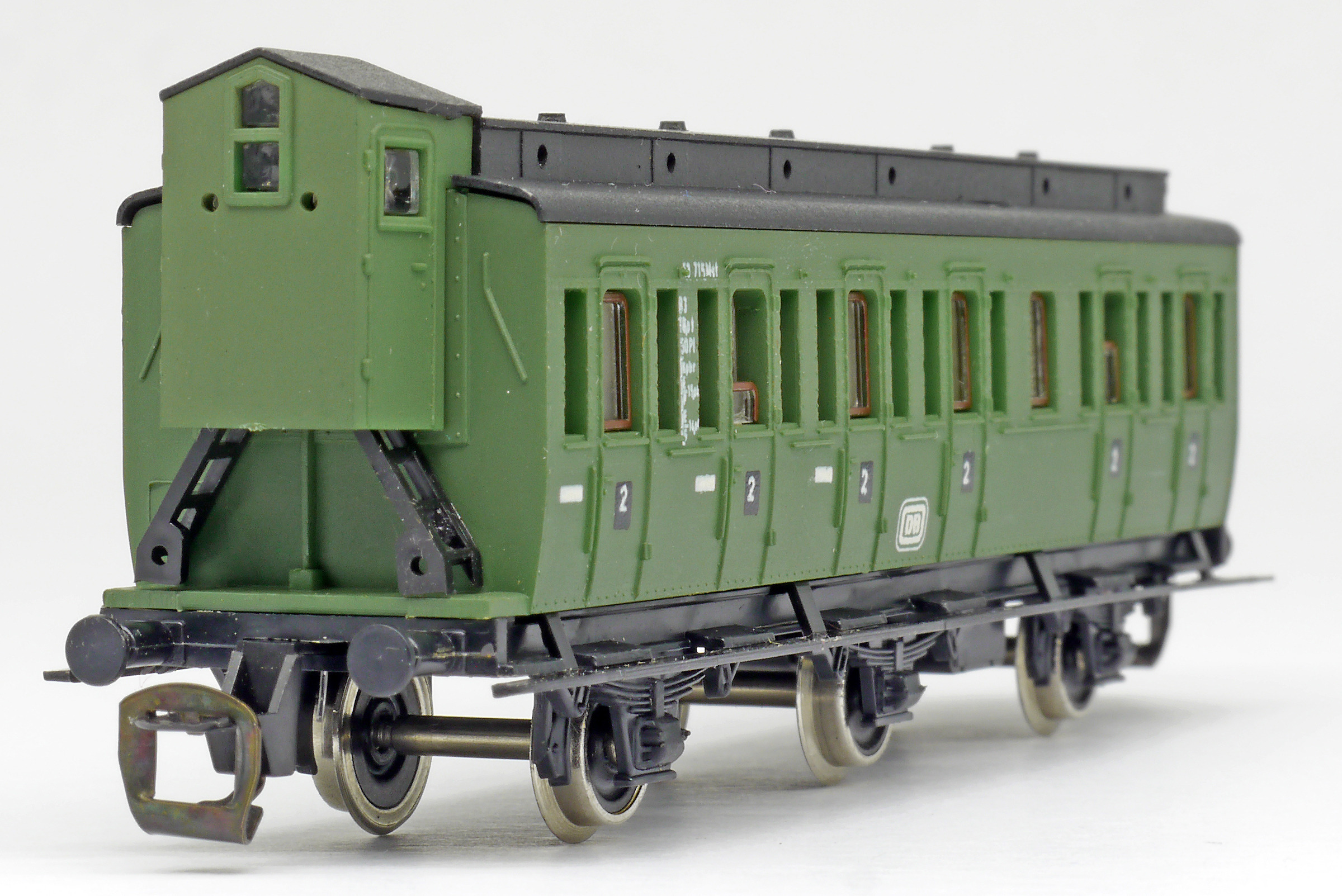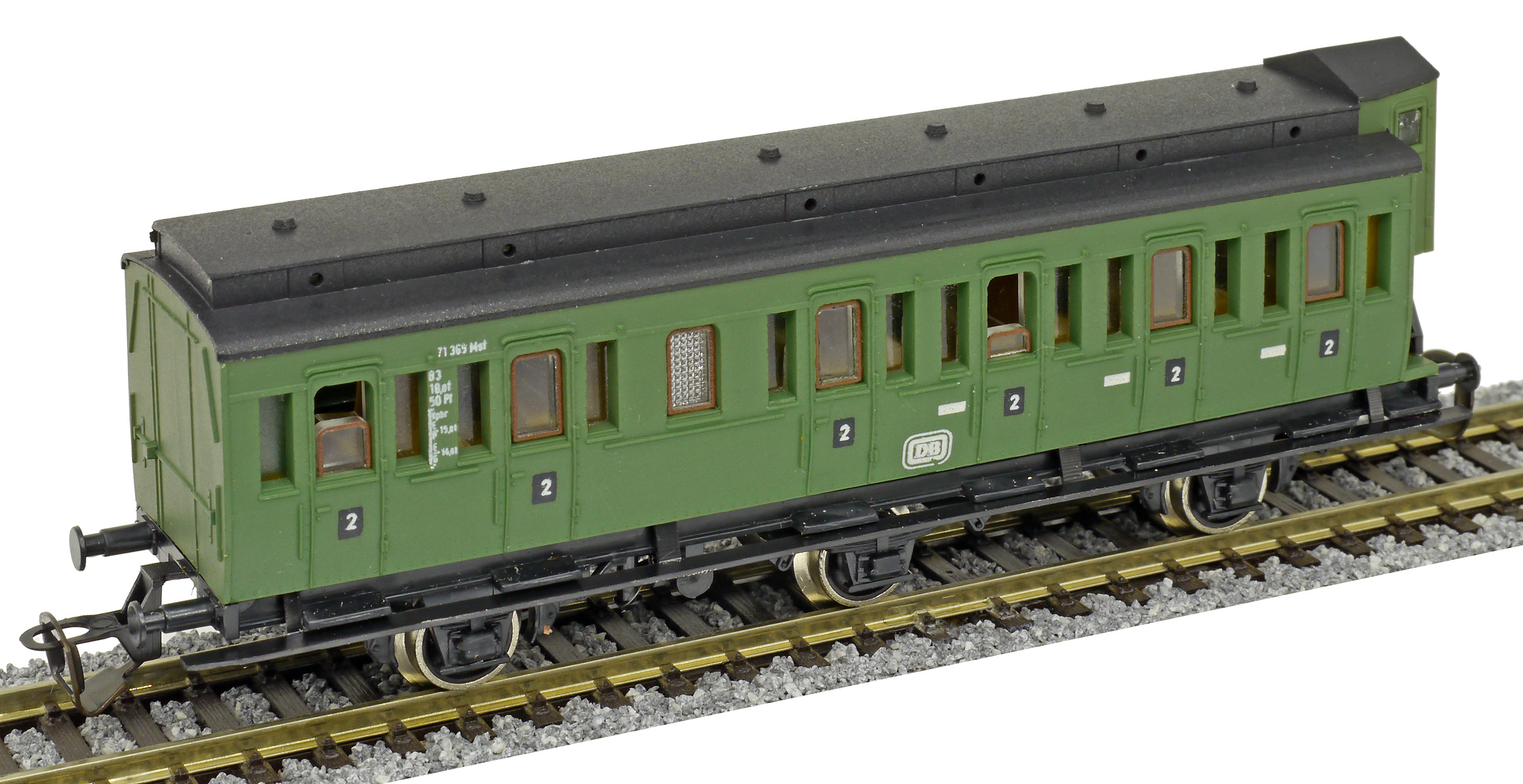 oddílový osobní vůz zelený s černou střechou a s brzdařskou budkou 2. tř.